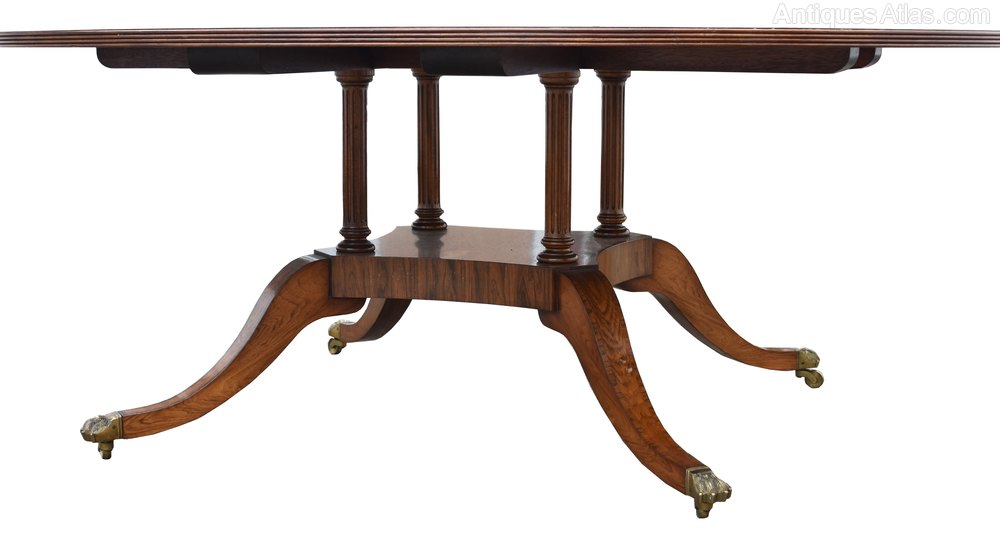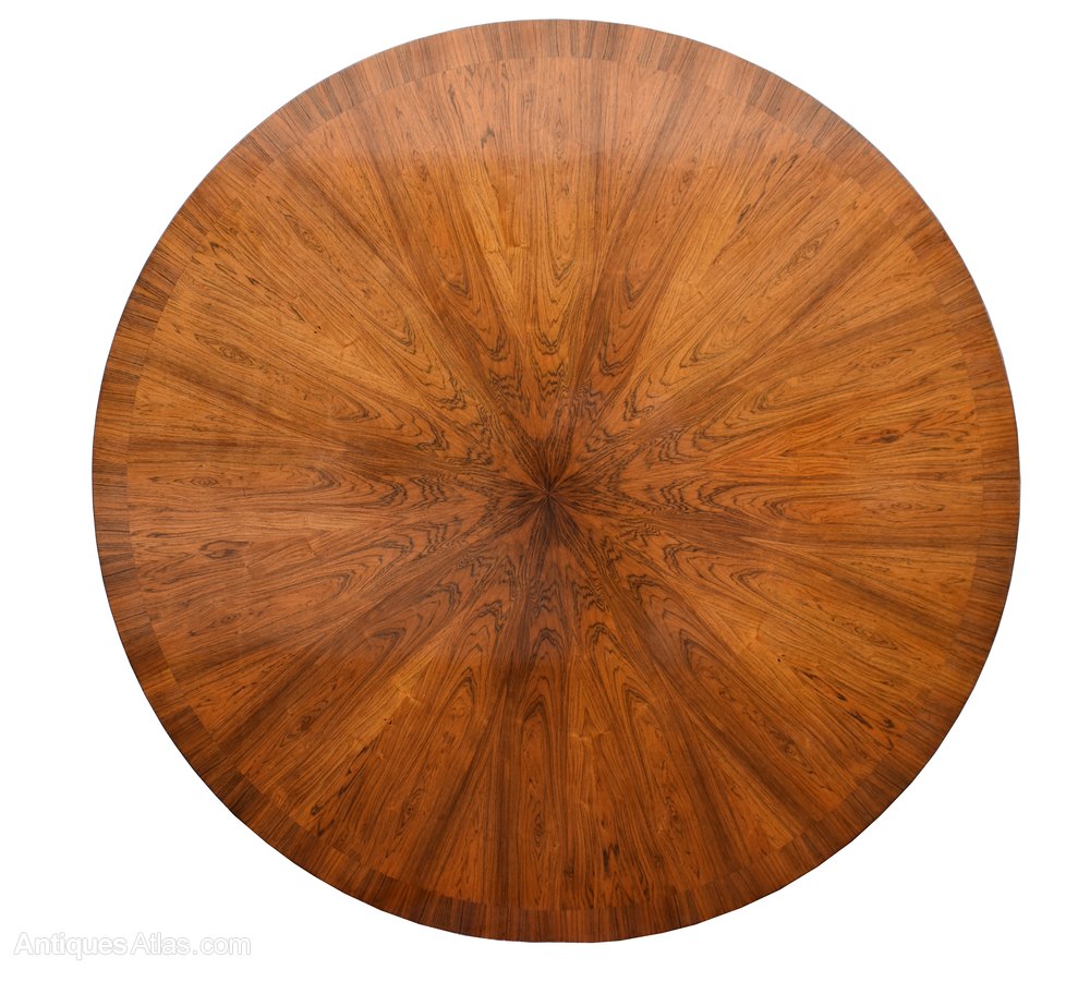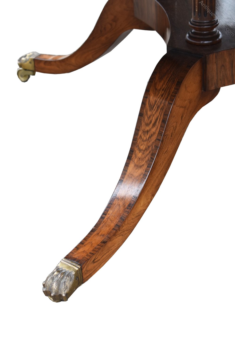 For sale is a good quality Rosewood Circular Dining Table, having beautifully figured radial veneers on the top, which is supported by turned and fluted columns, terminating on four splay legs raised on lions paw brass castors. Overall, the table is in very good condition for its age, having only minor wear. The table also comes with four additional leaves which fit over the table top if necessary, though these are not veneered in rosewood.