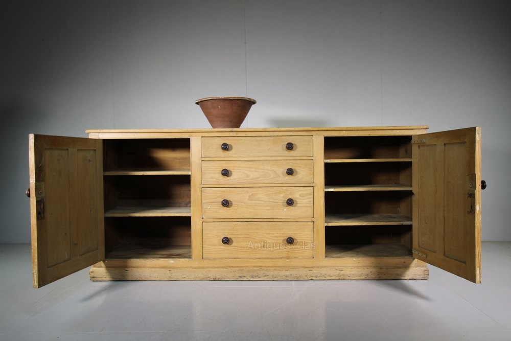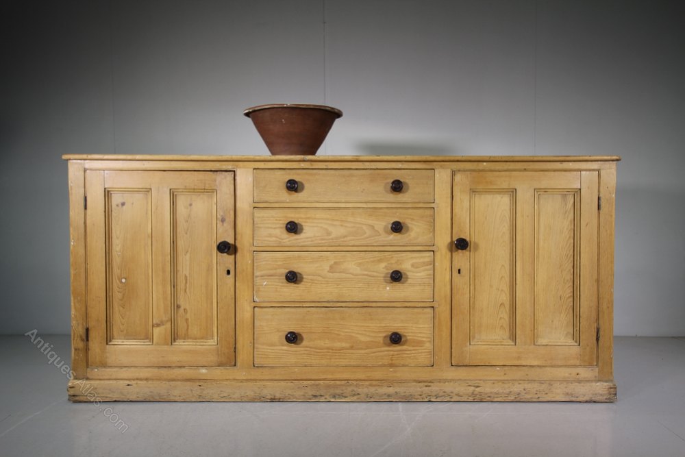 This is an impressive, English 19th century antique pine dresser, that would llok superb as part of a free-standing kitchen. In excellent original and clean condition. Dates from around 1840 and originally from the Cumbria region. To the centre are four, graduating drawers, these are flanked by two large storage cupboards. All the drawers and cupboards have the original turned wooden handles and the pine is in a natural scrubbed finish. A fabulous large scale antique pine kitchen dresser base and a nice feature is that it isn't too deep.