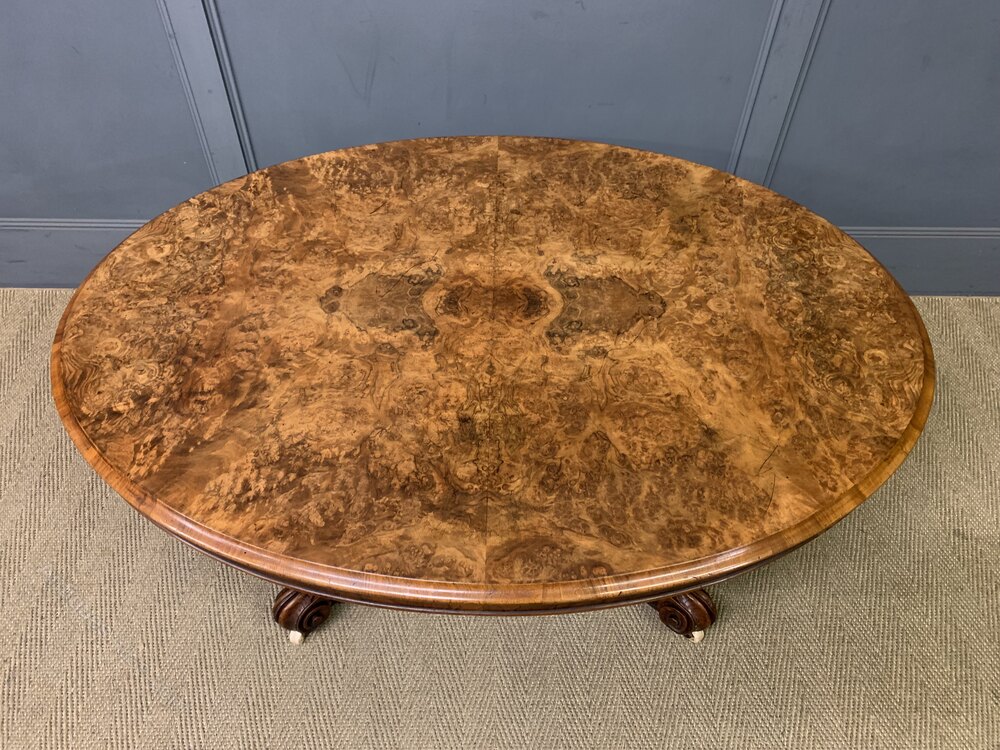 An attractive mid-Victorian period burr walnut coffee table. Of oval form and of generous proportions. Very well constructed in solid walnut with stunning burr walnut veneers. The quadraform base terminates in original brass and ceramic castors. Sympathetically repolished and now offered for sale in excellent condition, ready to go straight into the home. Splits into 2 sections for ease of installation.