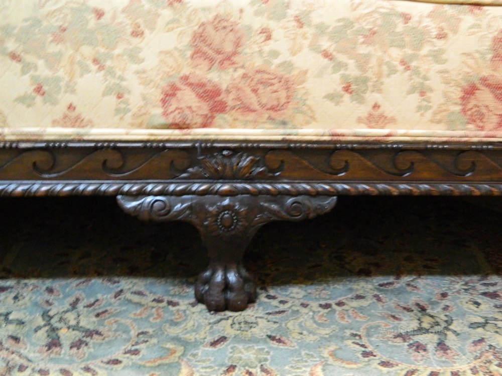 very impressive large sofa with decorative carved mahogany frame, shaped back and scroll arms, stylishly upholstered in a gold / burgundy patterned fabric, raised on wonderful hairy paw feet.