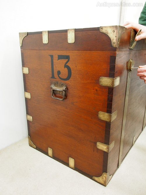 Circa 1870, unusual, large size colonial teak travelling trunk. With brass mounts and corners, and also unusual brass strapping that incorporates the locking mechanism. The interior is fitted with a lid locking mechanism and also has a removable tray with shaped handles. The number 13 has been painted on to either side.