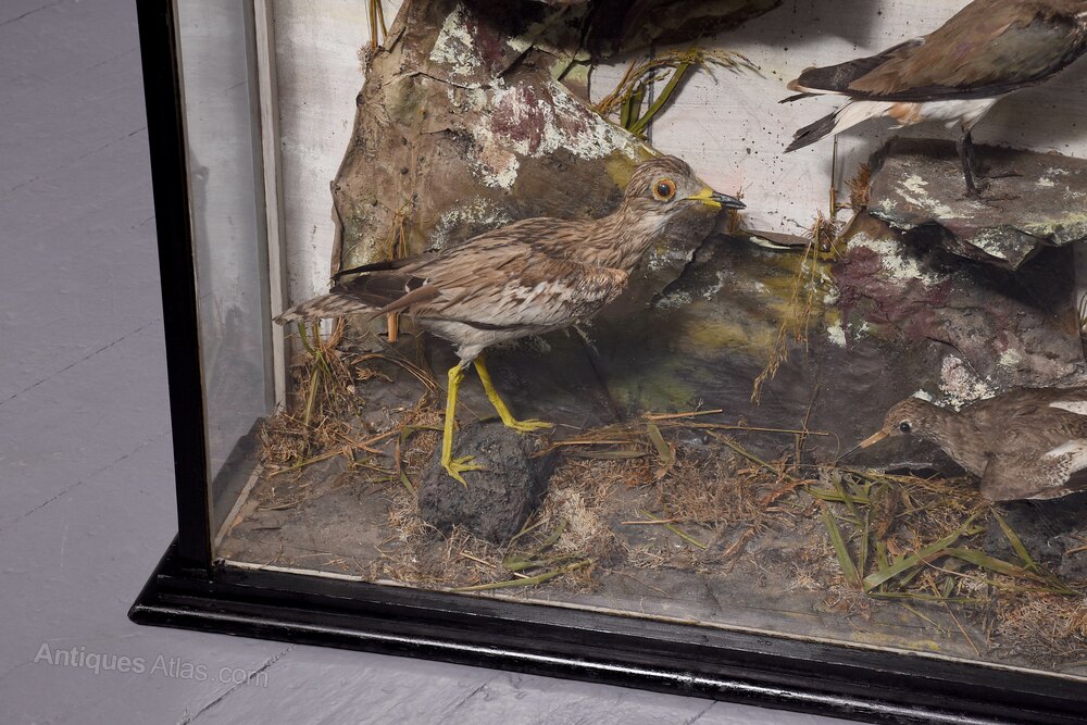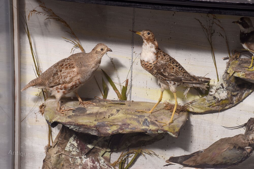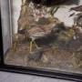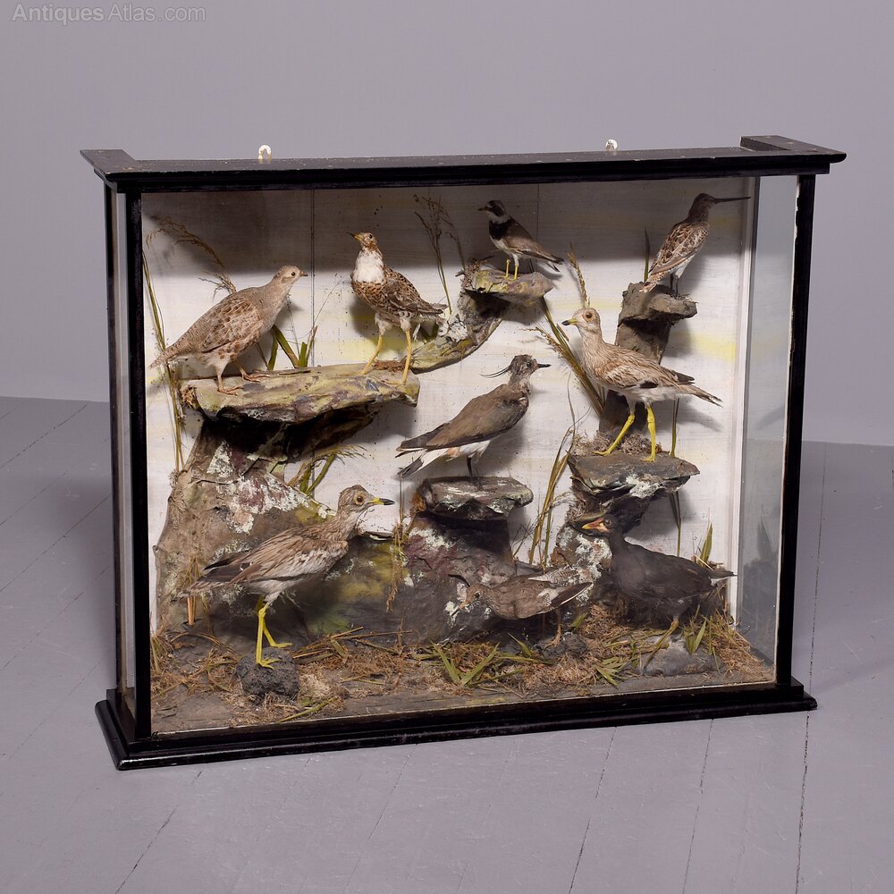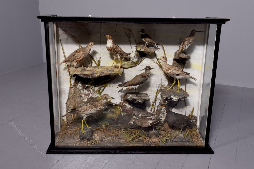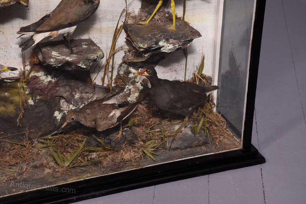 Circa 1880. Large Victorian 9 woodland birds taxidermy in an ebonized wooden case. With 9 large native wild birds within a naturalistic scene with foliage and moss in an ebonized glazed cabinet.