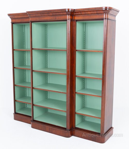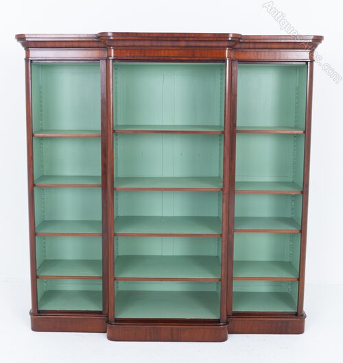 A large and impressive Victorian mahogany breakfront open bookcase, standing upon a substantial plinth base.