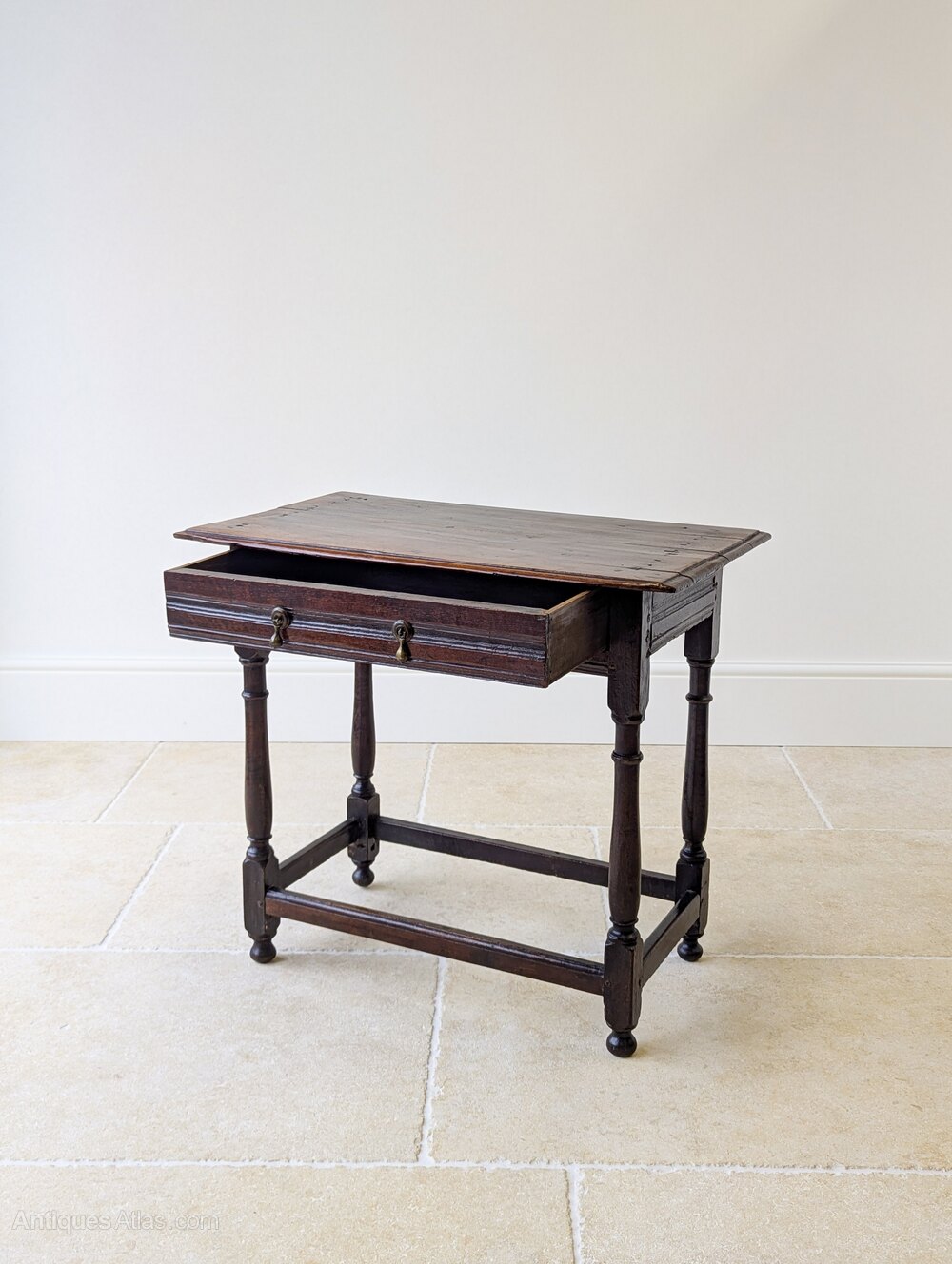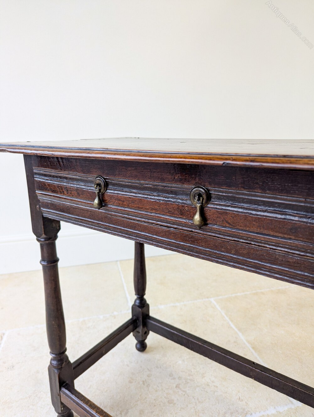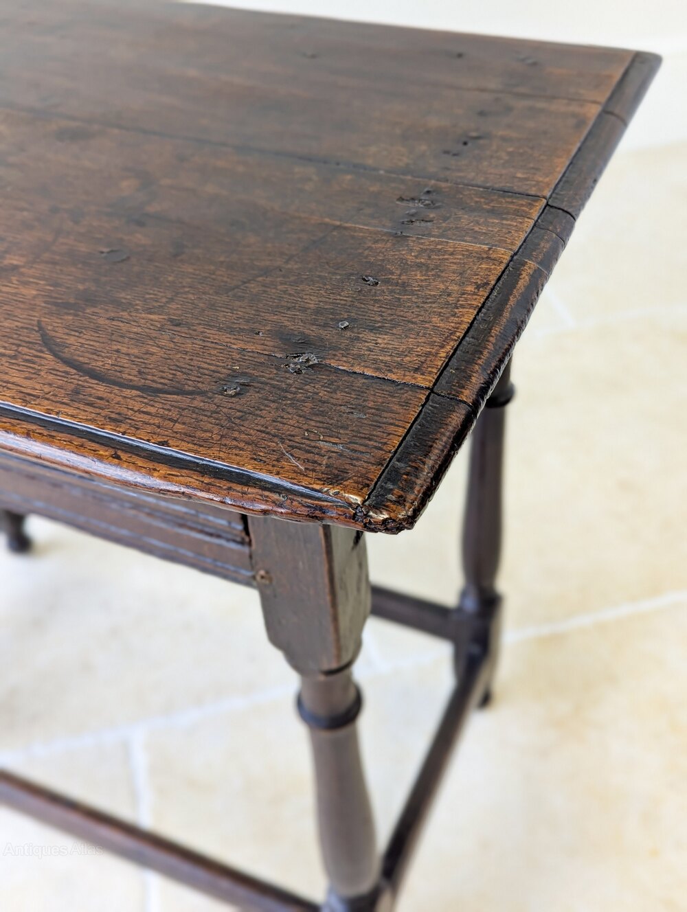 A fine oak side table, dating to around 1680–1700. Well-proportioned and of honest provincial character, the rectangular top is formed of thick oak boards with thumbnail-moulded edges worn smooth through centuries of use, the surface glowing with a richly developed, lustrous depth of colour.