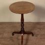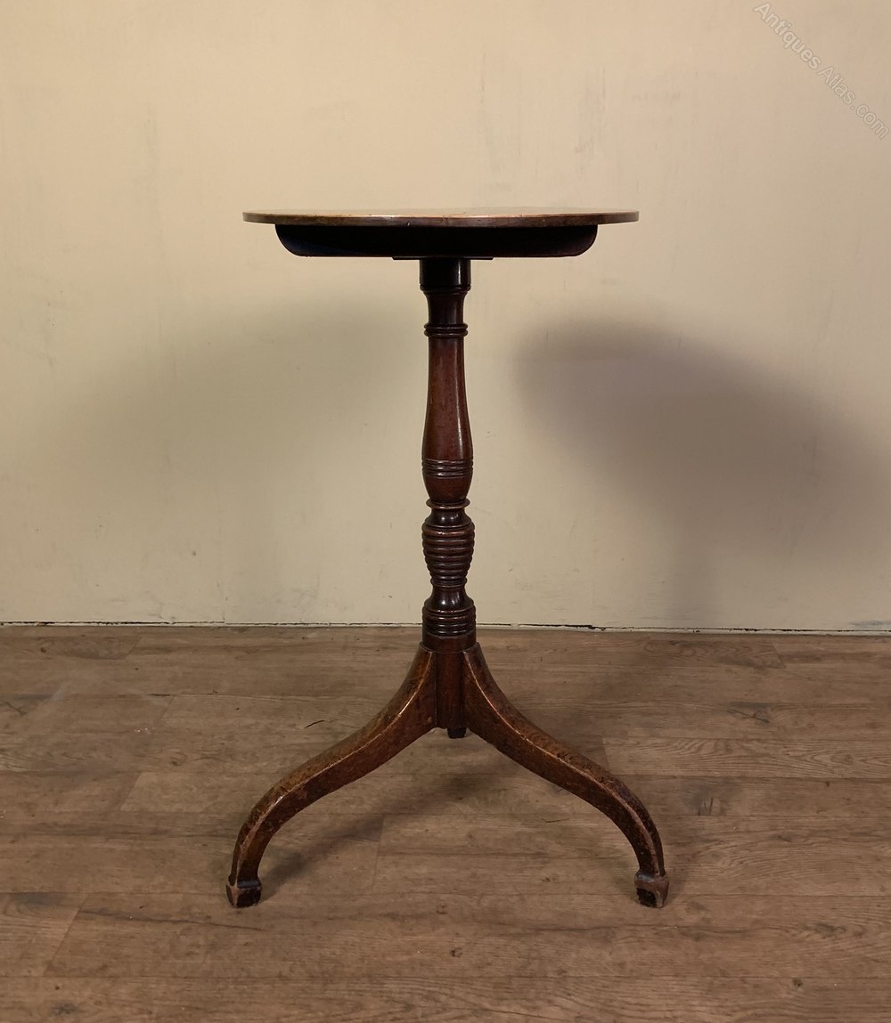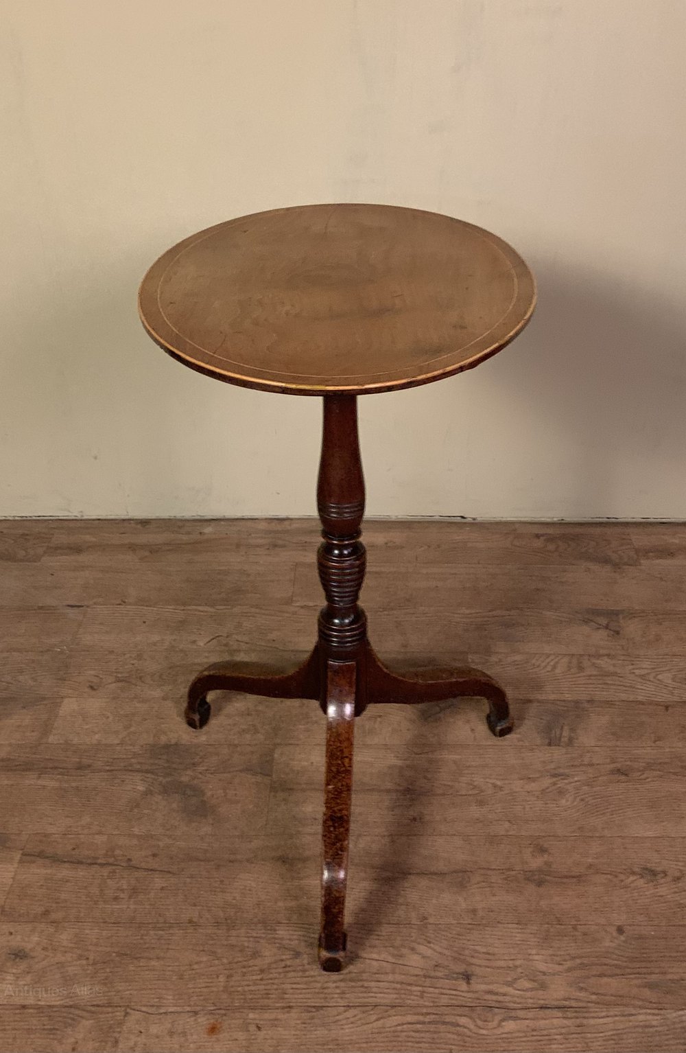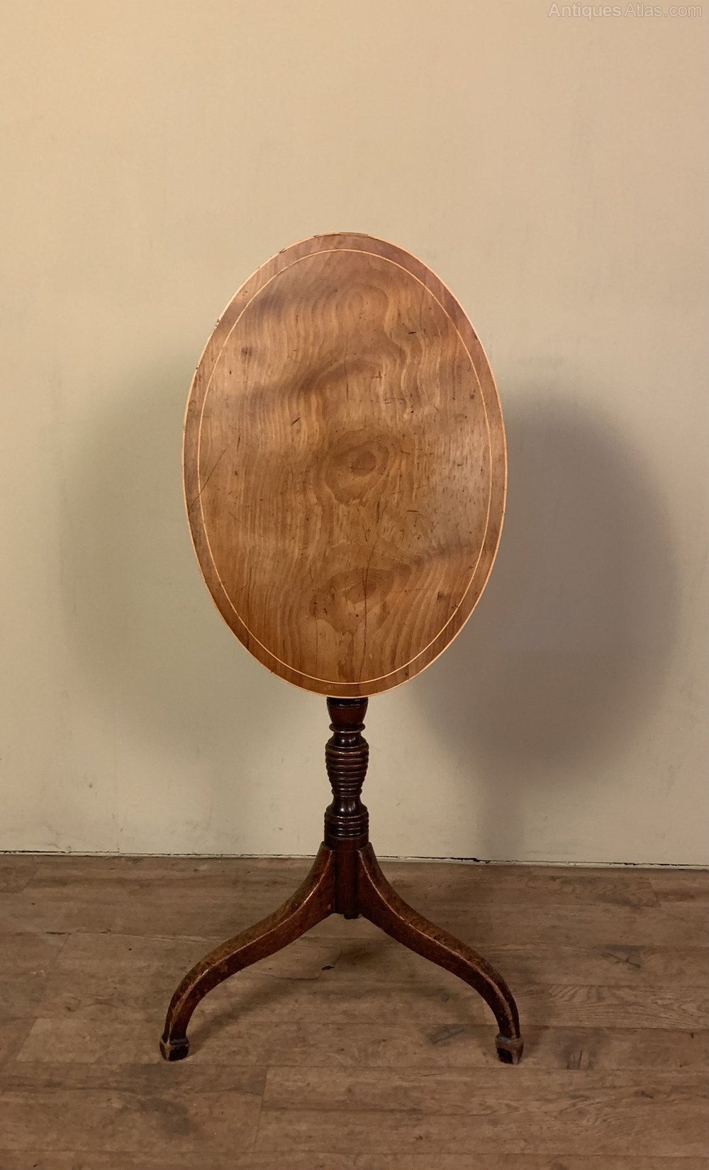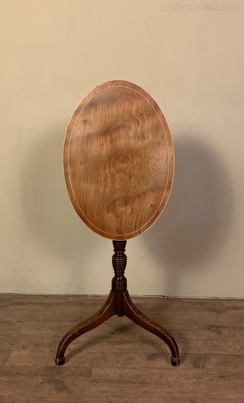 Dating late eighteenth century a good quality Sheraton style tilt top wine table with a wonderful faded oval top with boxwood edging and string inlay raised on a ring turned column supported by a well shaped tripod base with spade feet in original condition and patina.