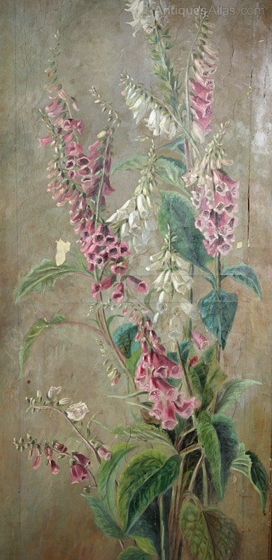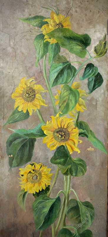 Unusual late 19th four-fold dressing screen with superb hand painted floral panels c1890. Moving from spring to autumn the plants featured are foxgloves, sunflowers, hollyhocks and virginia creeper. Backed with an attractive and original striped fabric. Each of the hinges folds both ways allowing the screen to the used in any shape. Some damage to the creeper panel and missing some of the edge molding.