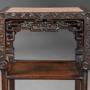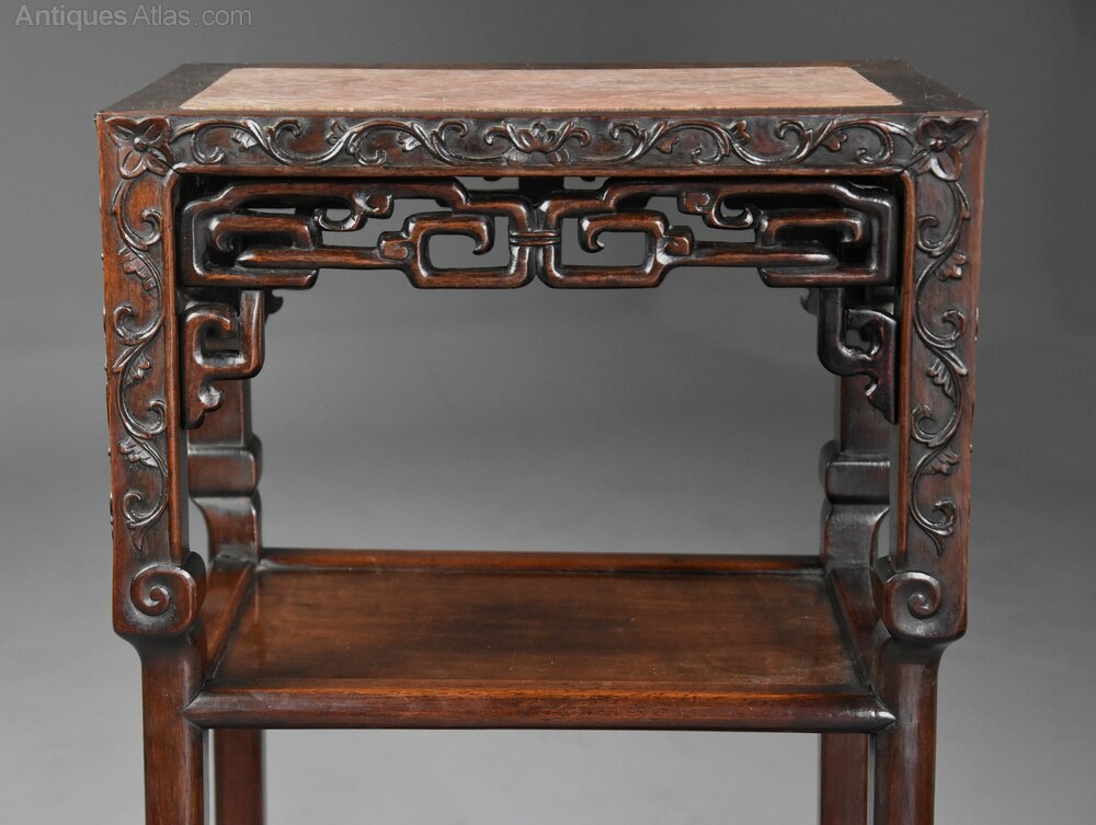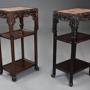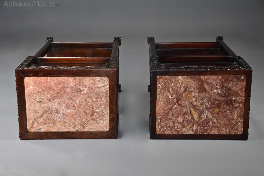 These pot stands each consist of a rouge marble inset top surrounded with a hardwood banding, the frieze below with superb foliate and floral carved decoration of lotus flowers (a symbol of purity and devotion) and cherry blossom (a symbol of love and passion) terminating with carved scroll design, below the frieze a pierced and carved stylised bamboo design.