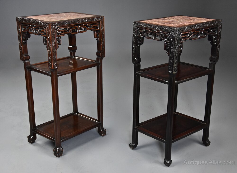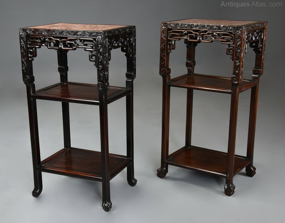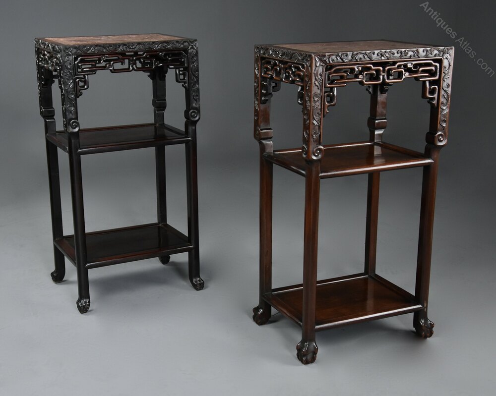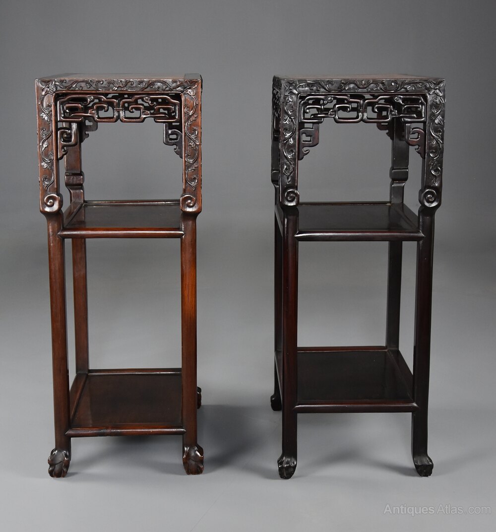 A late 19th century (circa 1890) well matched pair of freestanding Chinese hardwood pot stands of rectangular form.