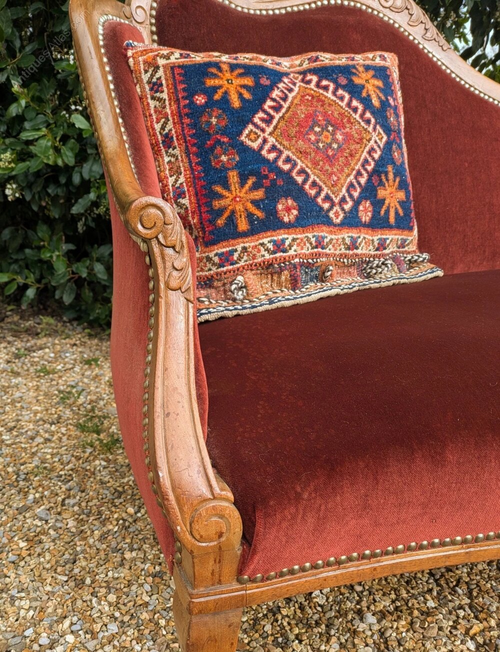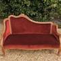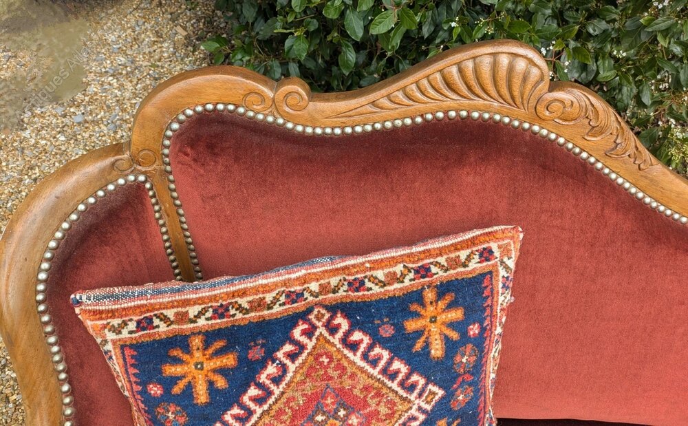 This is a neat late Victorian chaise lounge sofa with solid walnut frame in good order reupholstered in a warm red cotton velvet cloth and studded with brass head nails. This is in excellent condition ready for use and is a nice neat size so will fit in a multitude of situations. (Cushion is not included).