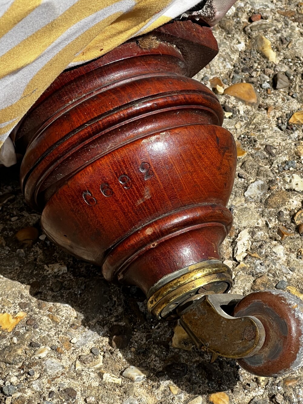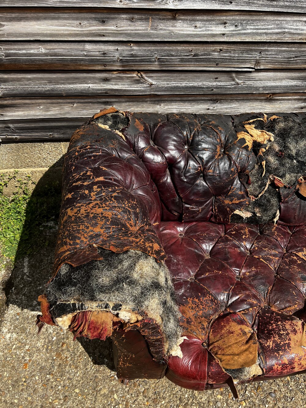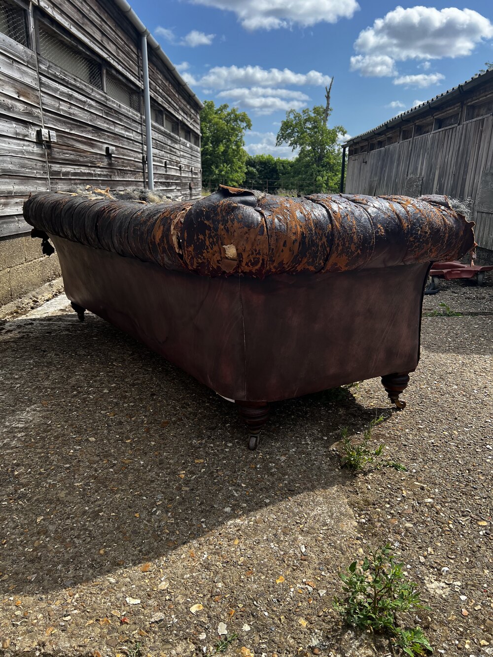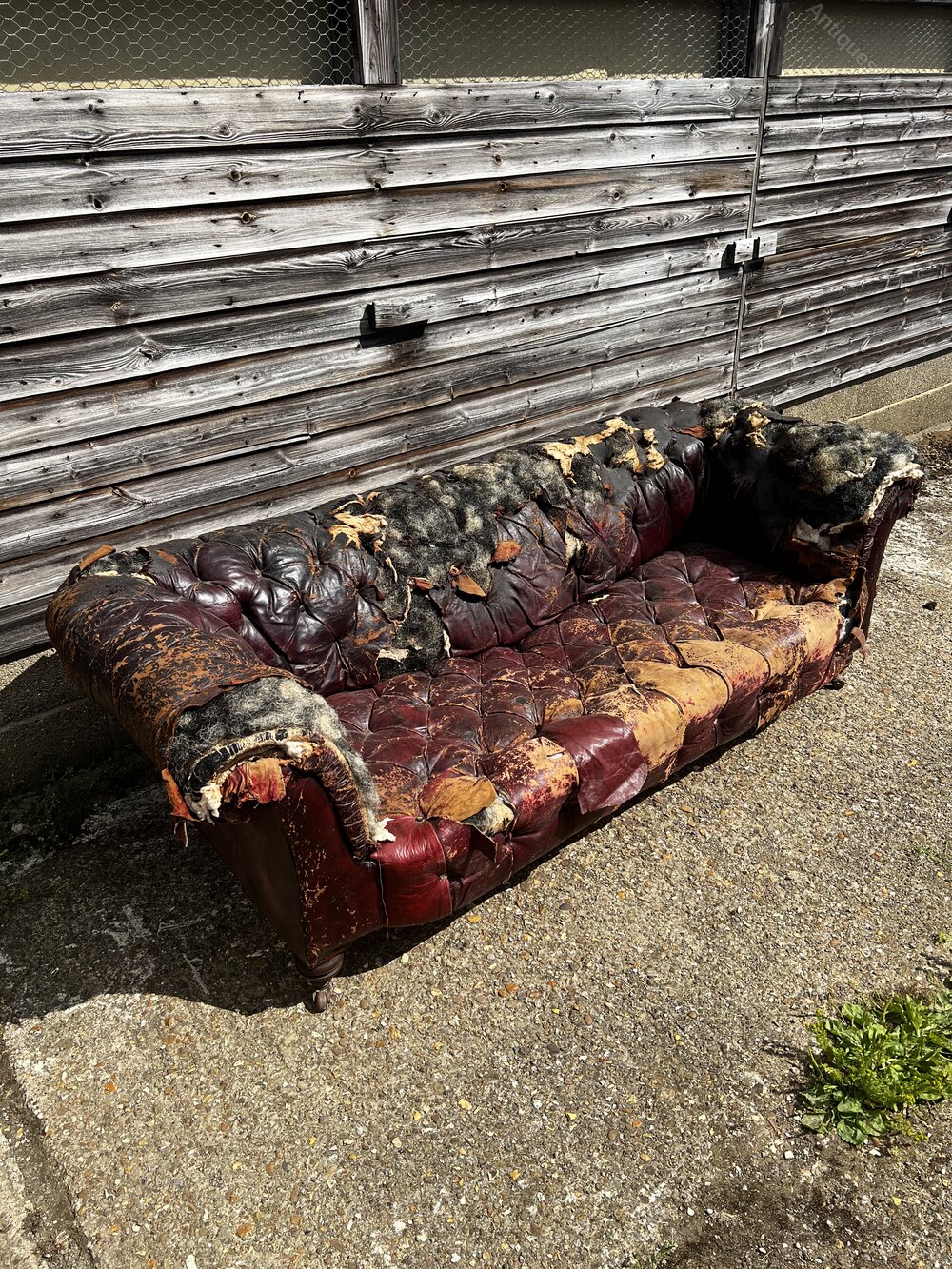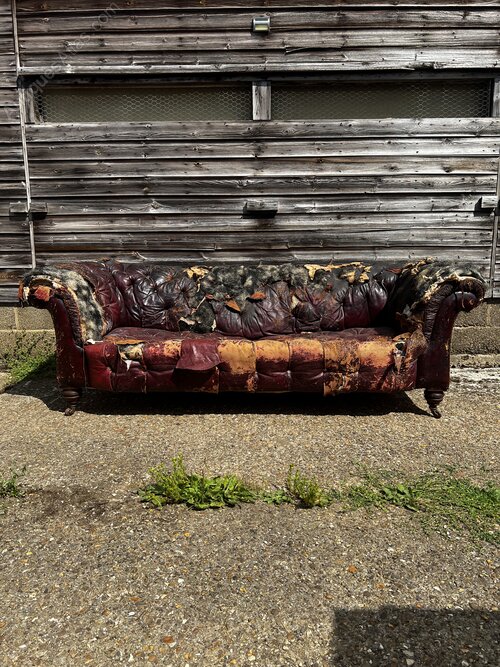 Measures 7 feet wide and is a heavy beast. 7’ long by 3’ deep with a seat height of 17”. All my articles are offered for sale in "as found" condition and as such may need work.