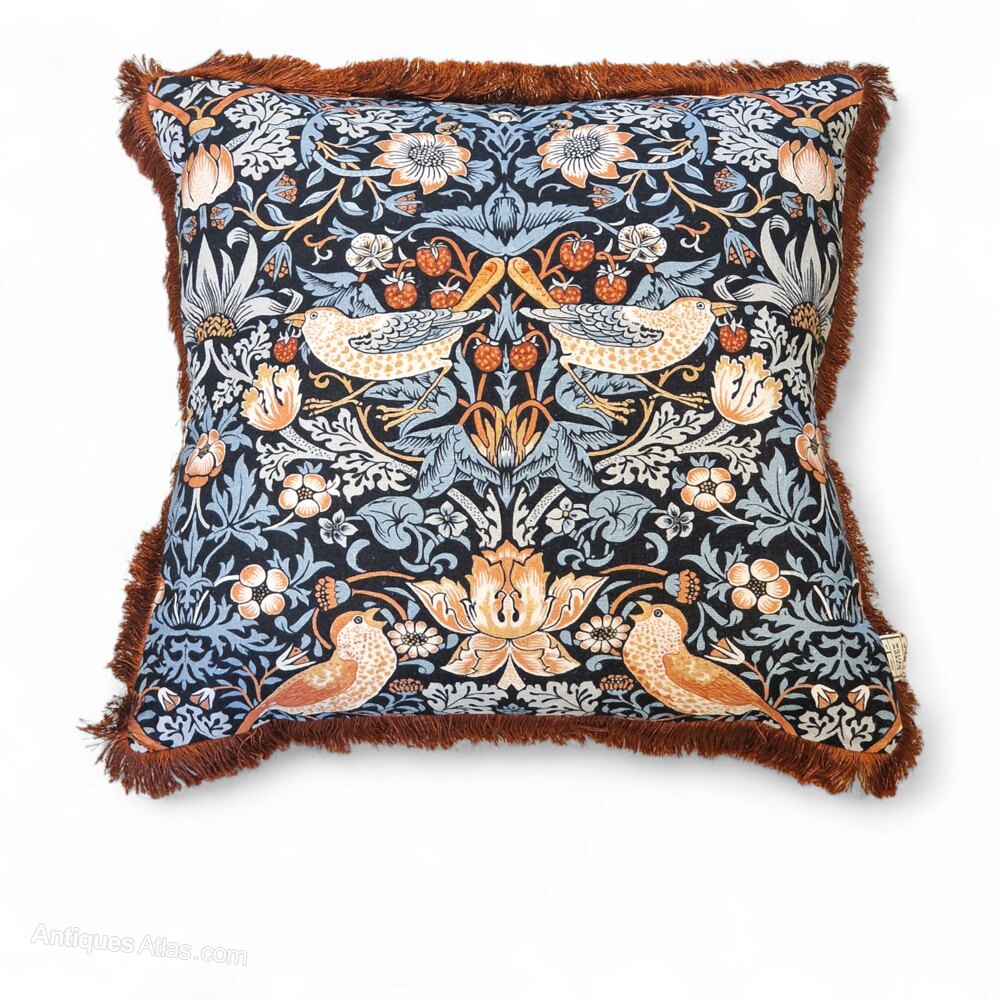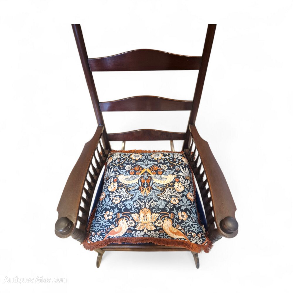 A brand new unused cushion by William Morris At Home showcasing his best known designs, the Strawberry Thief, has been added to the chair seat base as a seat cushion. William Morris based the pattern and the name on the thrushes which frequently stole strawberries in the kitchen garden of his countryside home, Kelmscott Manor in Oxfordshire. This fabric was originally made in 1883 -1919 which coincides with the age of this rocking chair - also William Morris and William Birch were contemporaries both working within the context of the Arts and Crafts movement.