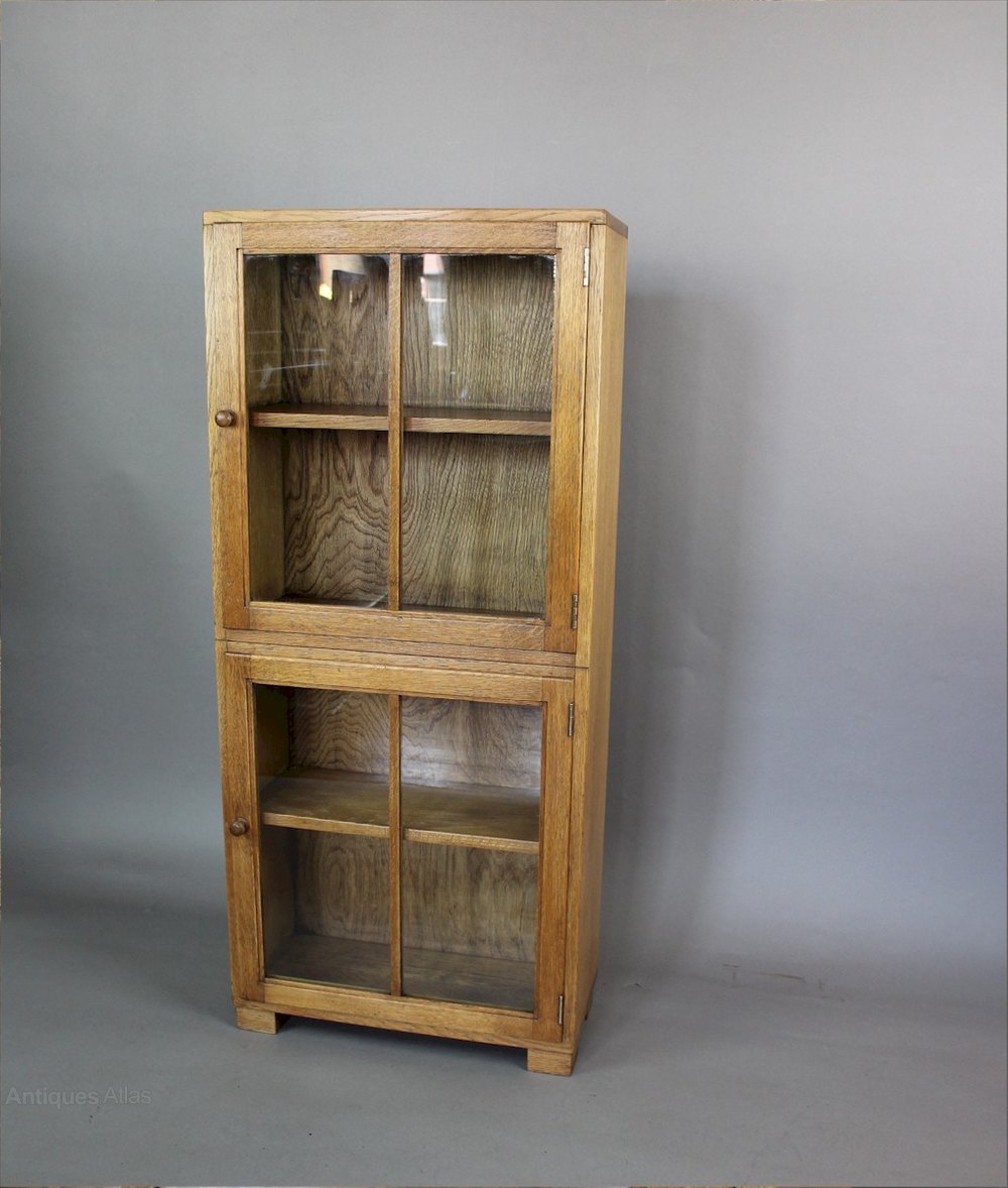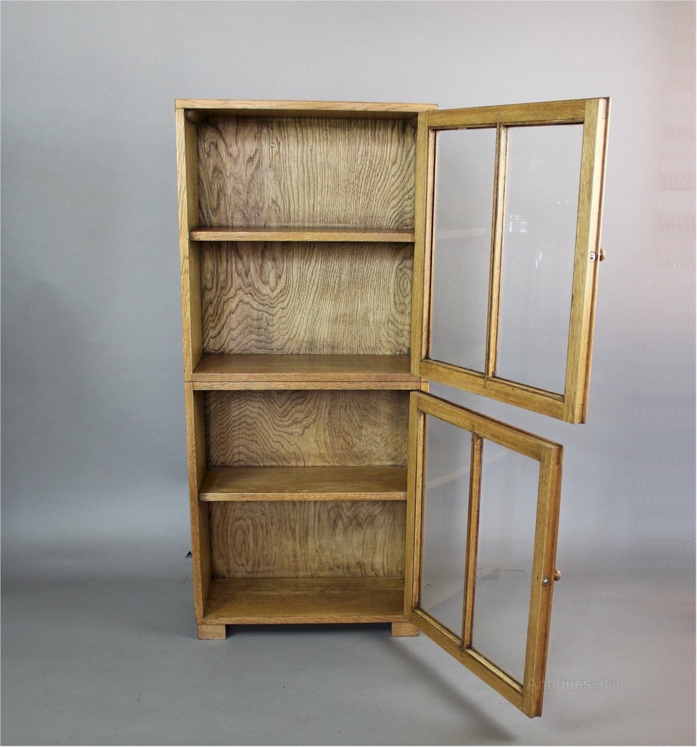 Light oak glazed bookcase by Heals c1930 . Measures 103 cm (40.5 in) high x 46 cm (18 in) wide x 20cm (8 in) deep. Each door 50 in (19.75 in ) high