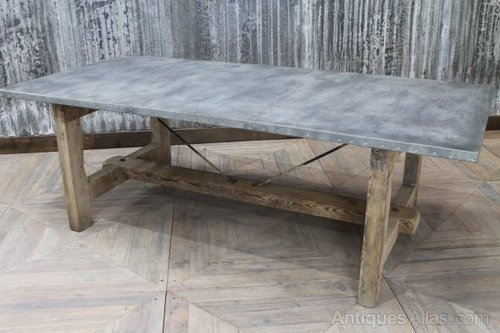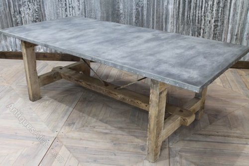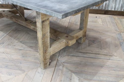 The table stands on an original aged Victorian pine base, and features a reworked zinc top.