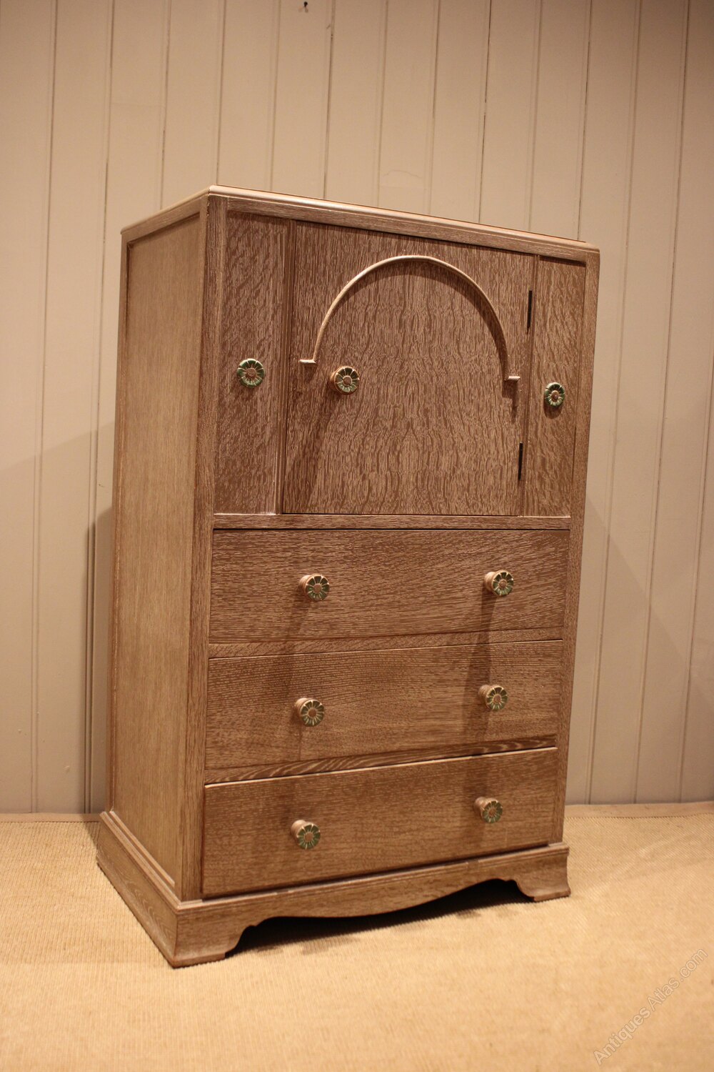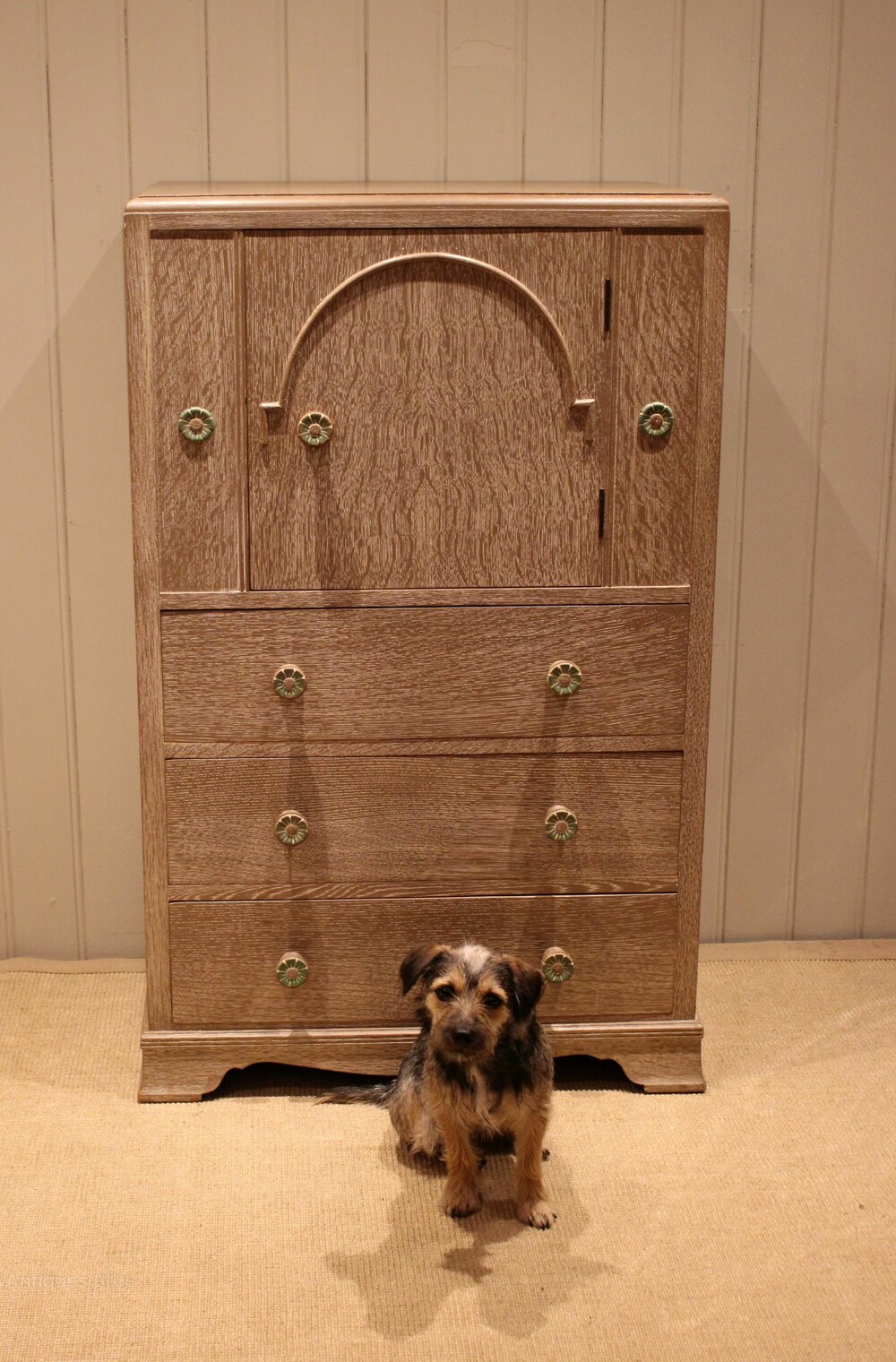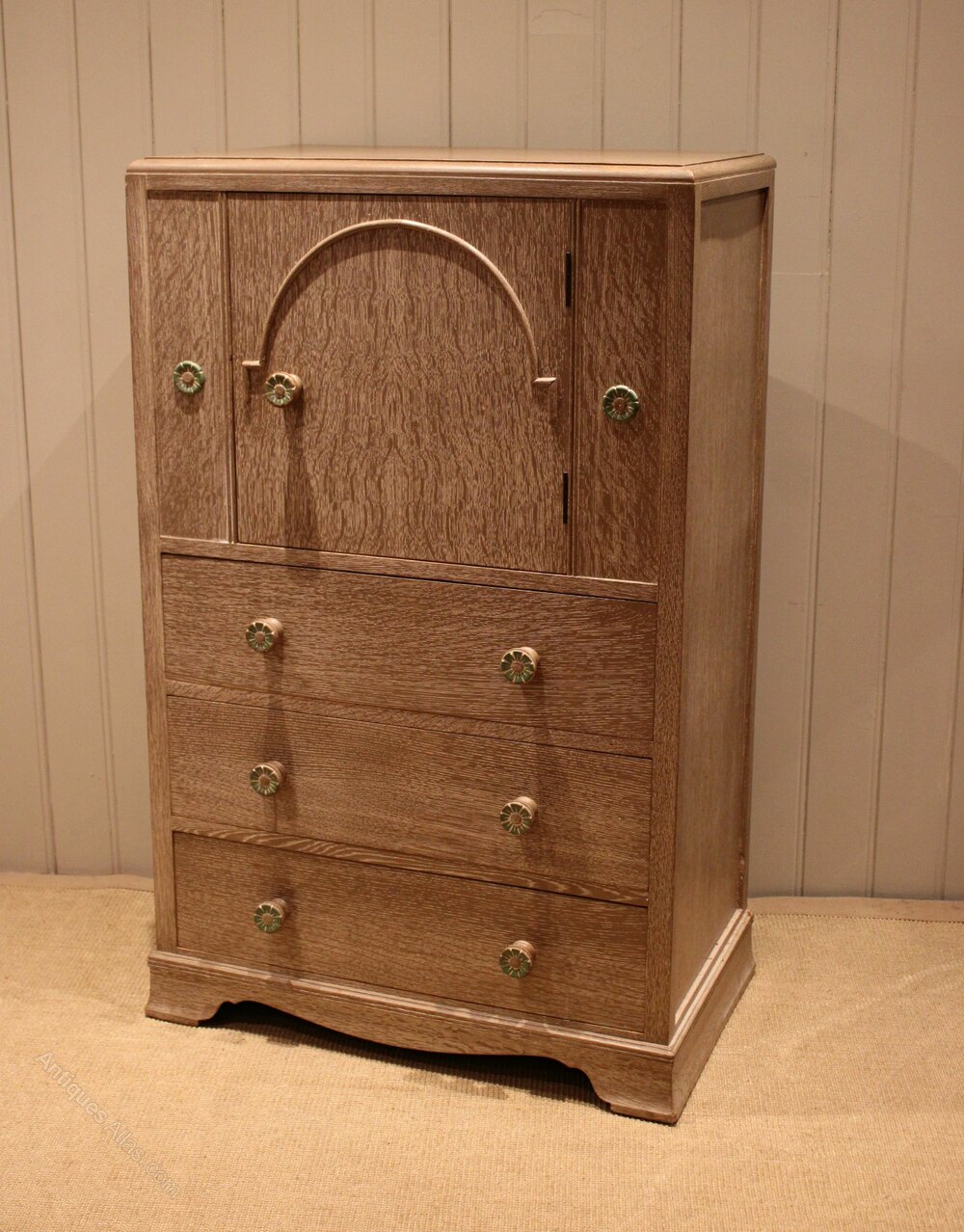 Lime washed grey oak chest having a shelved cupboard to the top , above three long drawers , raised on a plinth base. The drawers are 16 cm deep .