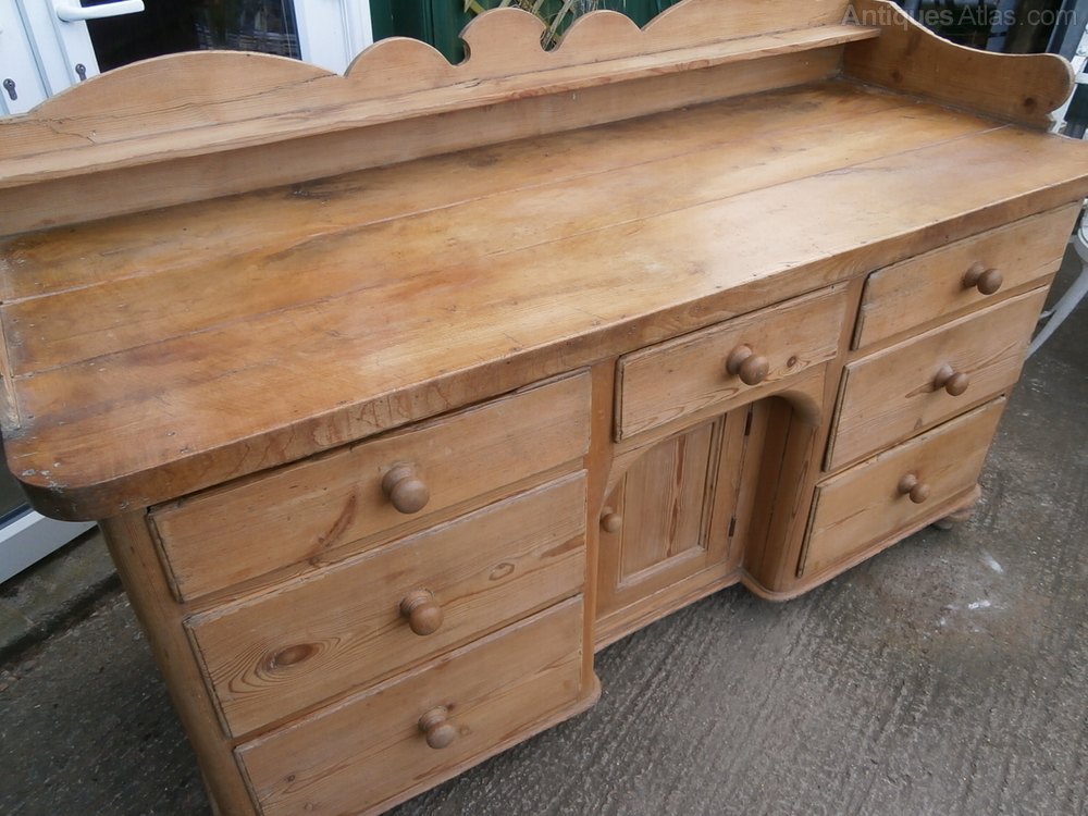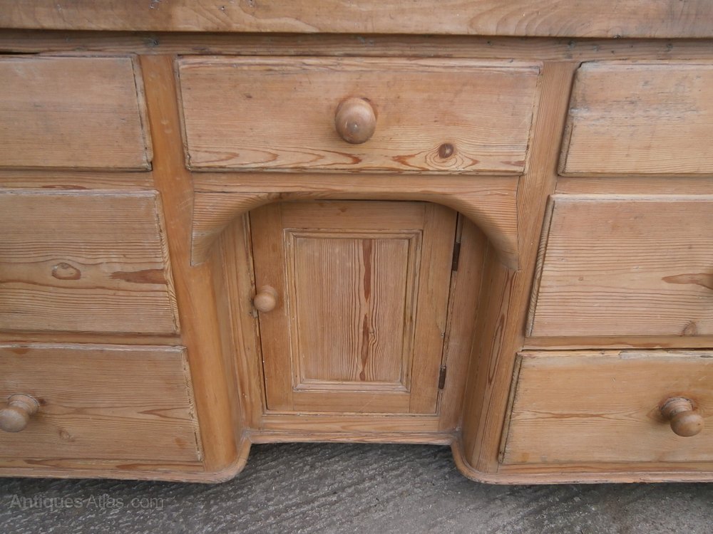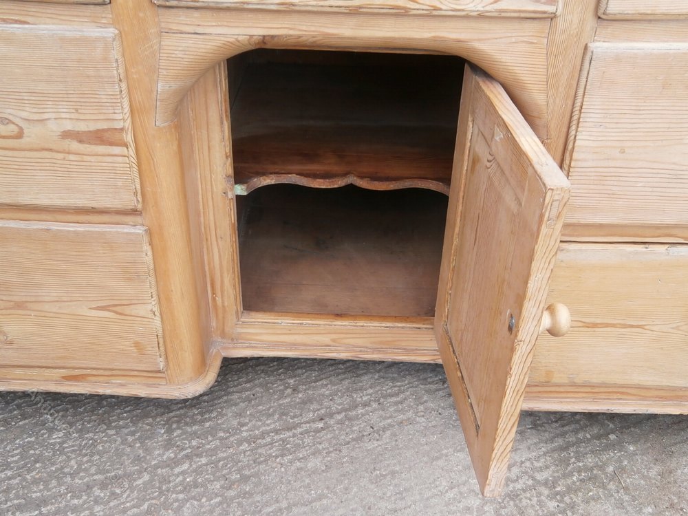Made of pitch pine with a thick sycamore top, this dresser has 7 drawers and one small cupboard with interior shelf.