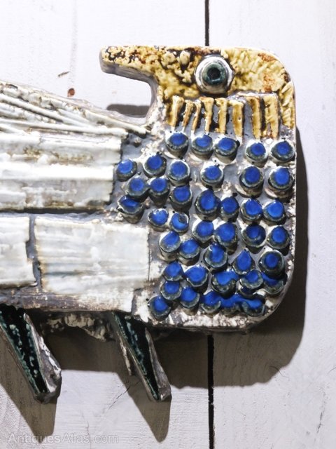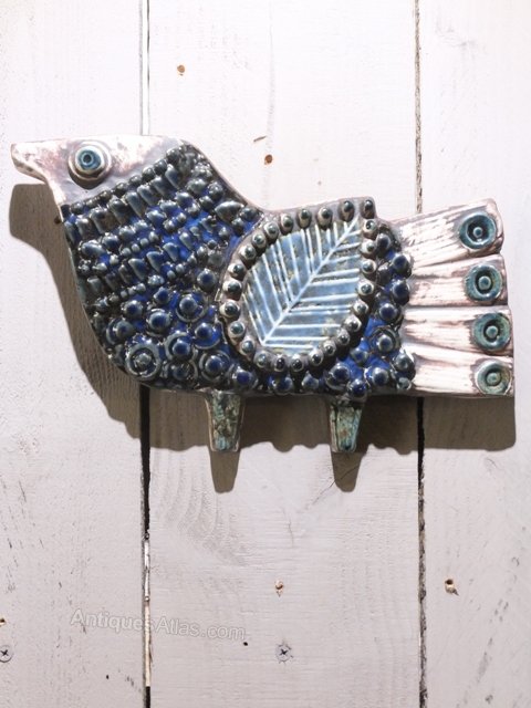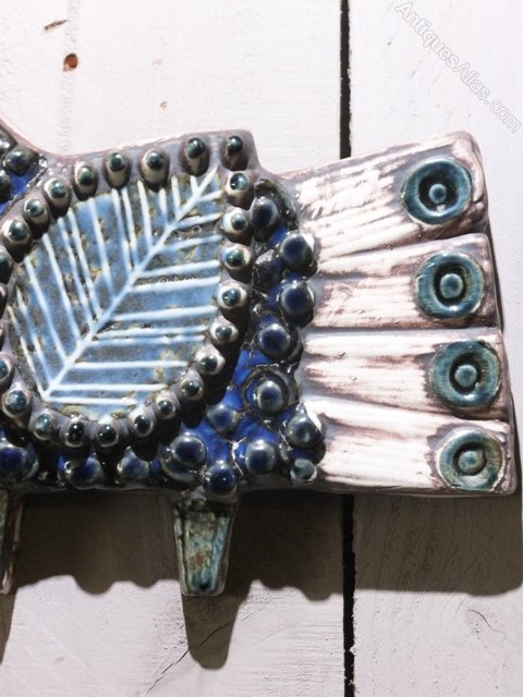 “Fagel” bird plaques. Two good examples, the larger bird in cream, blue and ochre the smaller in shades of blue with playful leaf design to the wing. Both with highly textured surfaces in high gloss, matt and sheen glazes.