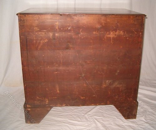 The desk has a single long drawer along the top and 3 further drawers, pine lined, to each side of the kneehole where there is a recessed cupboard. The drawers have the added benefit of a thin crossband inlay around them, and the desk stands on bracket feet.