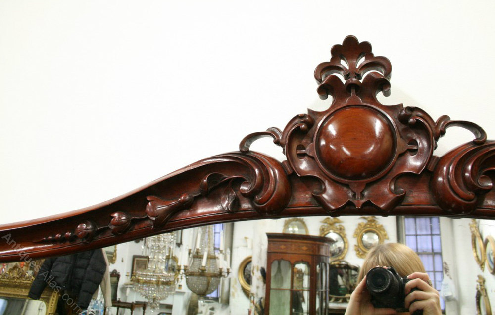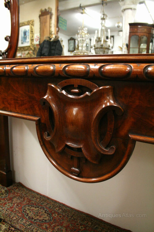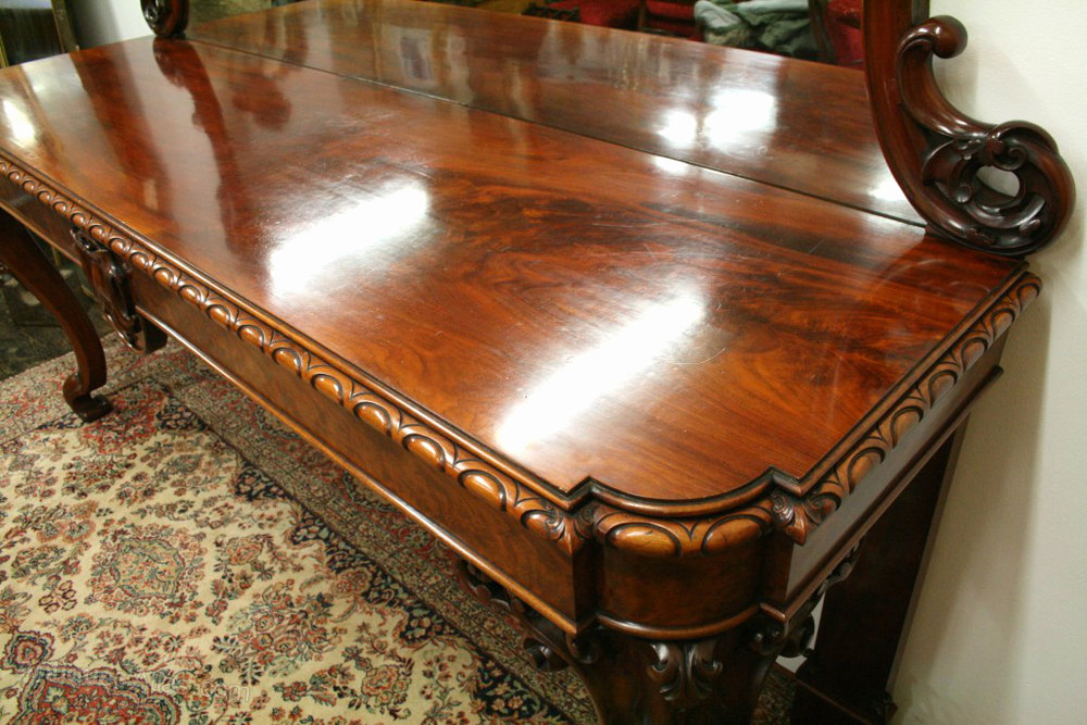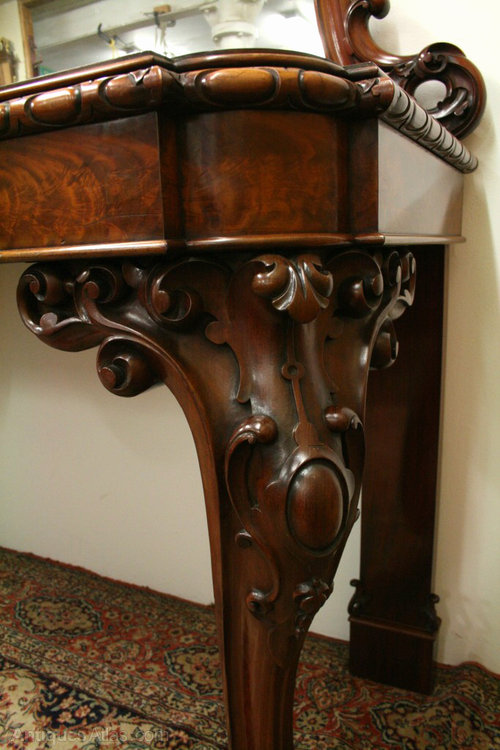Circa 1860, magnificent carved mahogany mirror back hall/serving table in finest quality figured mahogany, with a shaped ornately carved mirror back with an open carved cartouche, all standing on bold cabriole legs with foliate carved knees.