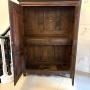 Inside, the Armoire is fitted with a single internal shelf above a pair of shallow drawers each retaining its original ring pull handles and early iron locks. The base interior shows the original oak planked floor, irregular and full of historic character, with a gently scalloped apron visible from the outside.