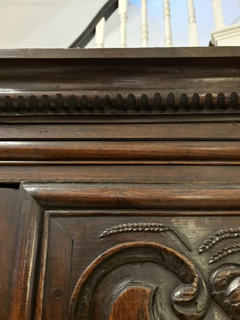 The armoire stands on a shaped apron and short cabriole legs, surmounted by a moulded cornice with dentil detail. Crafted from solid oak, the piece displays a fabulous rich colour and patina, developed over centuries to a deep, glowing tone that highlights the natural grain and character of the wood.