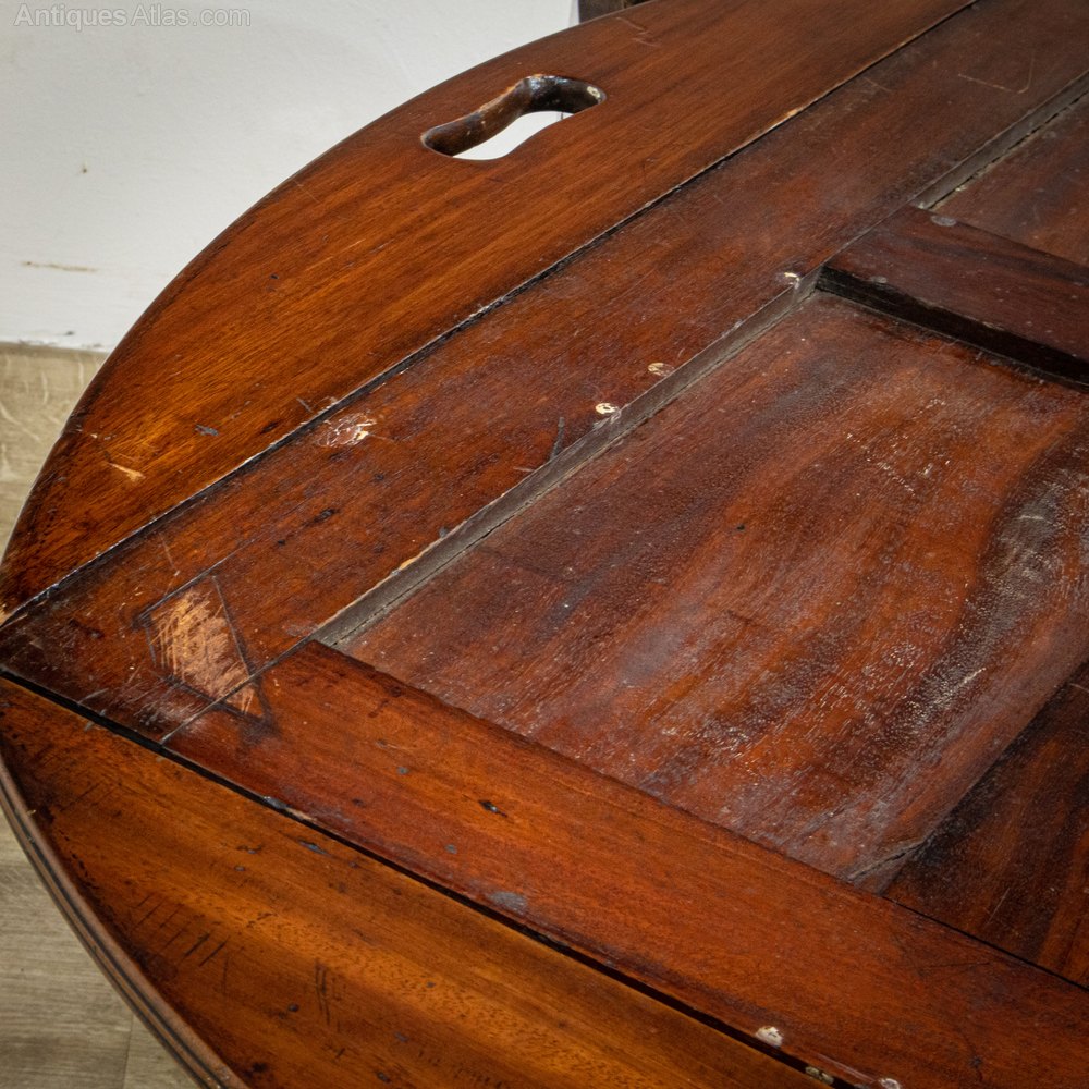 This tray dates to circa 1840, although the stand is later, and is made of mahogany. It originates from England.