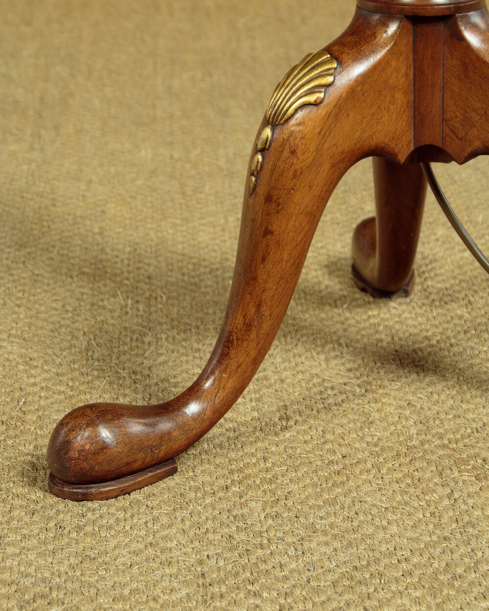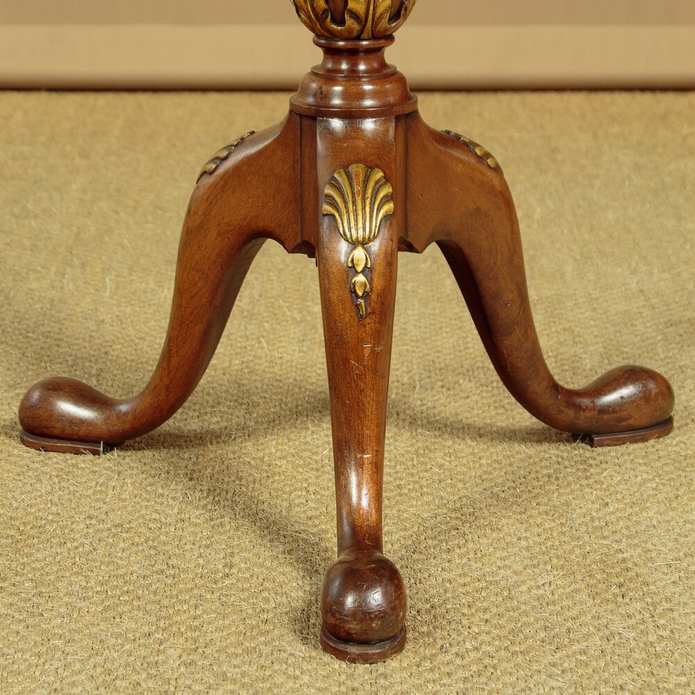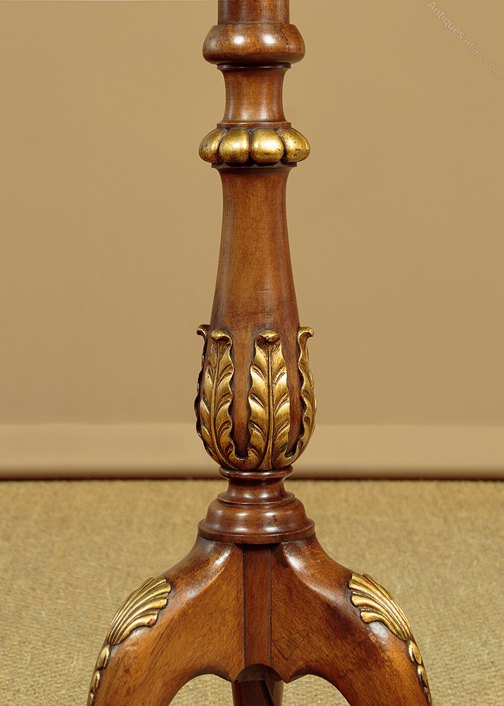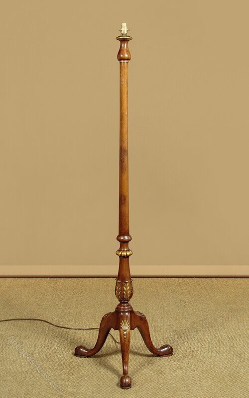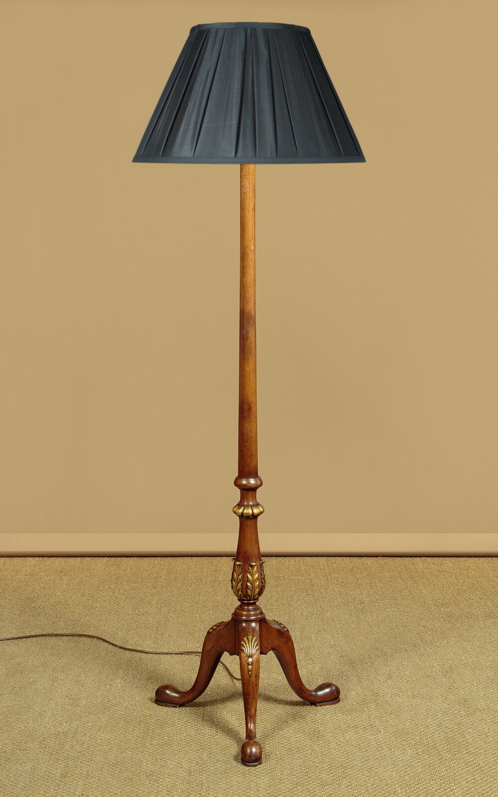 Good looking Georgian style mahogany and gilded standard lamp c.1930. Single bulb raised on a turned and tapering column with carved and gilded acanthus leaf detail around the base. Raised on tripod legs with carved and gilded scallop shells and pad feet. Excellent condition, rewired cleaned and waxed in our workshops.