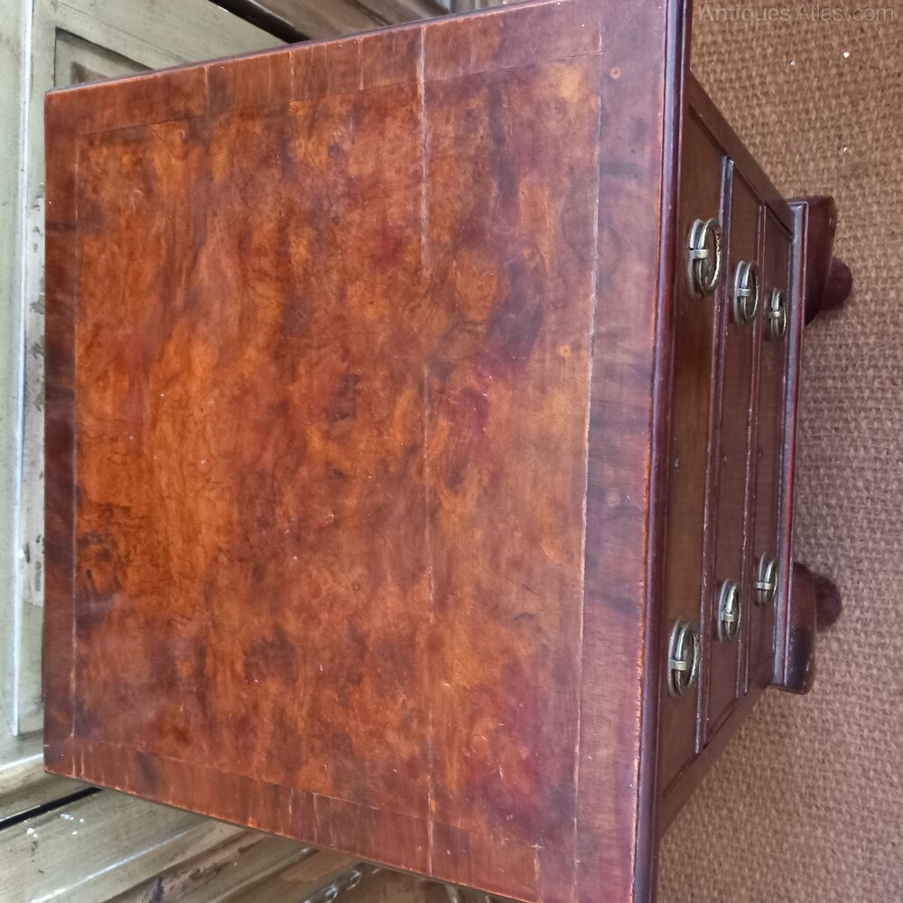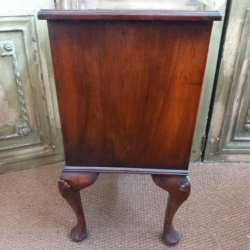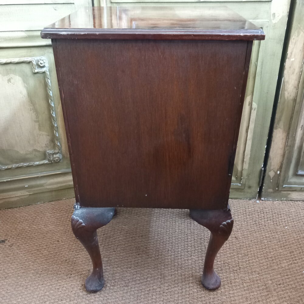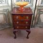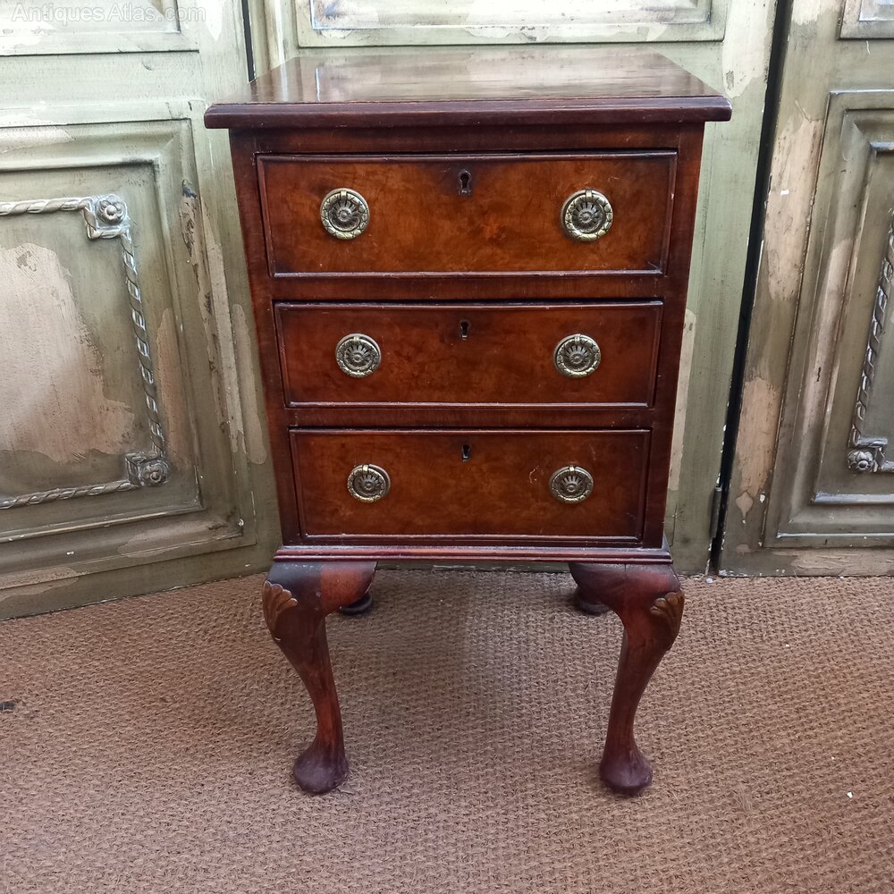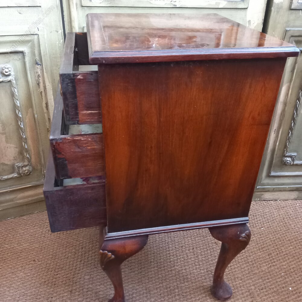 A mahogany and burr walnut chest of 3 drawers raised upon Queen Anne legs with shell carving in the Georgian style. A very useful chest for its size with the 3 good size draws that would work around the home as an occasional Chest/Table.
