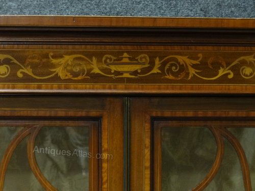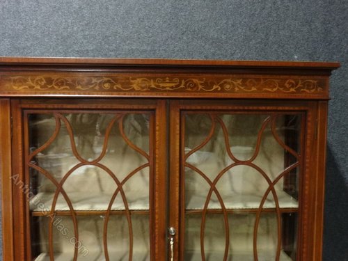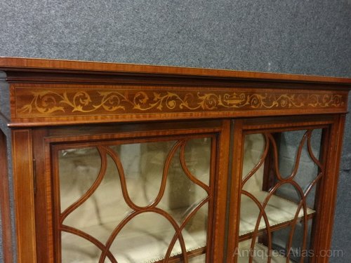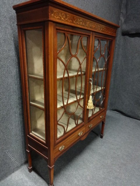 An excellent quality mahogany display cabinet with marquetry decoration. inlaid astral glazing to the doors, brass slamming strip, two drawers under, relined, all in excellent condition.