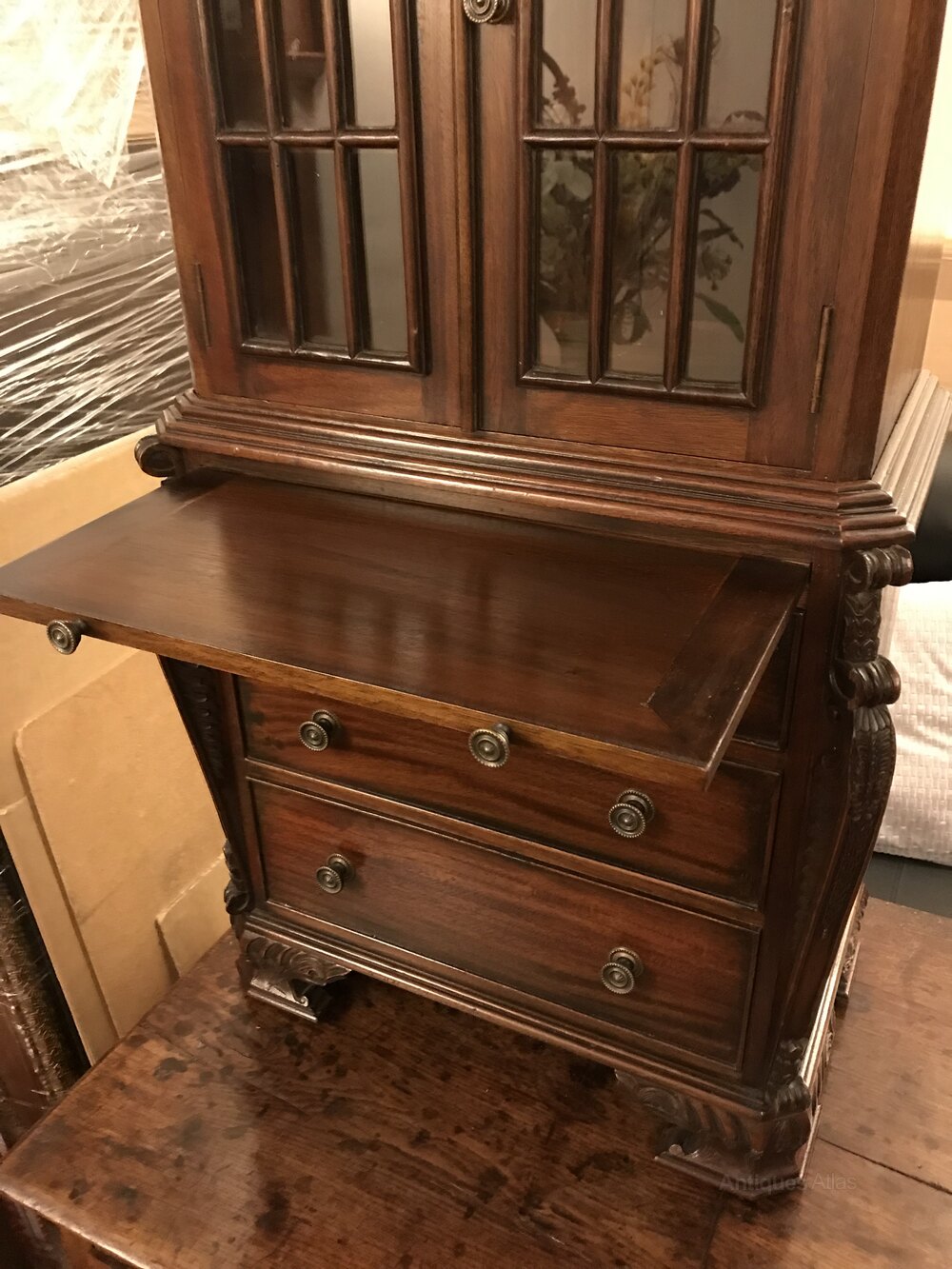 Small Reduced to 1/4 size Miniature Bureau Bookcase cabinet with a 3 drawer base and writing slide below the glazed cabinet with fixed shelves and the top surface being for display, such as a clock for example or blue and white jugs etc.