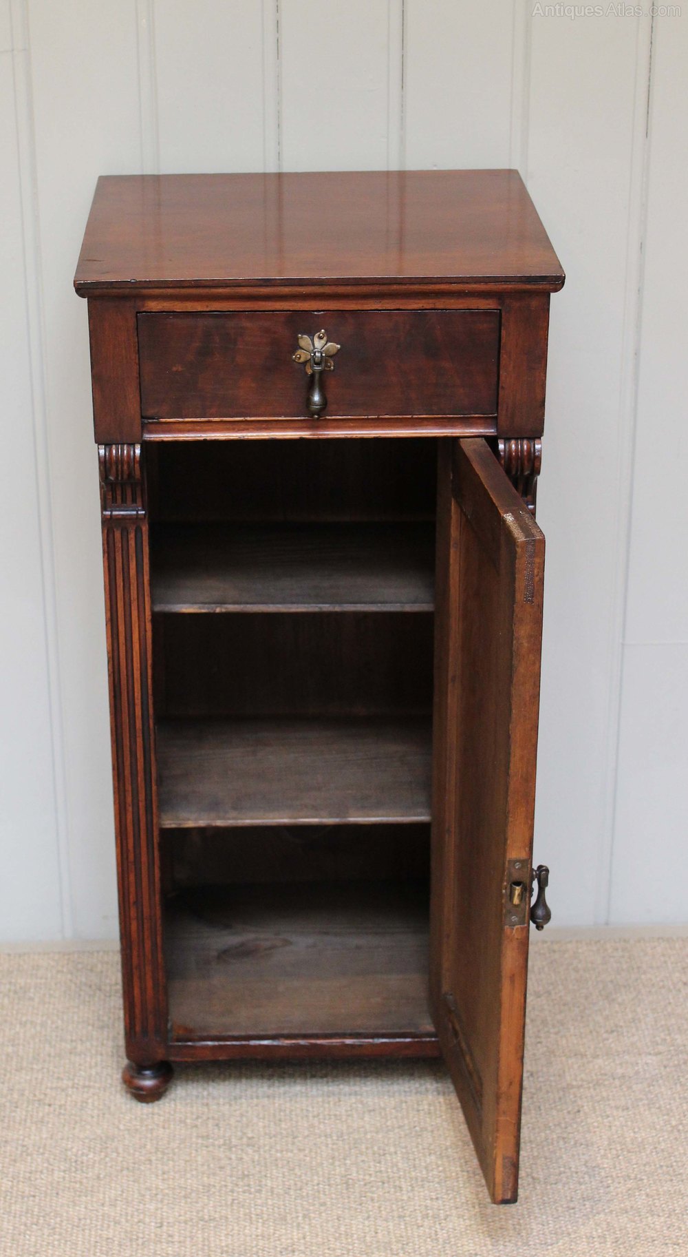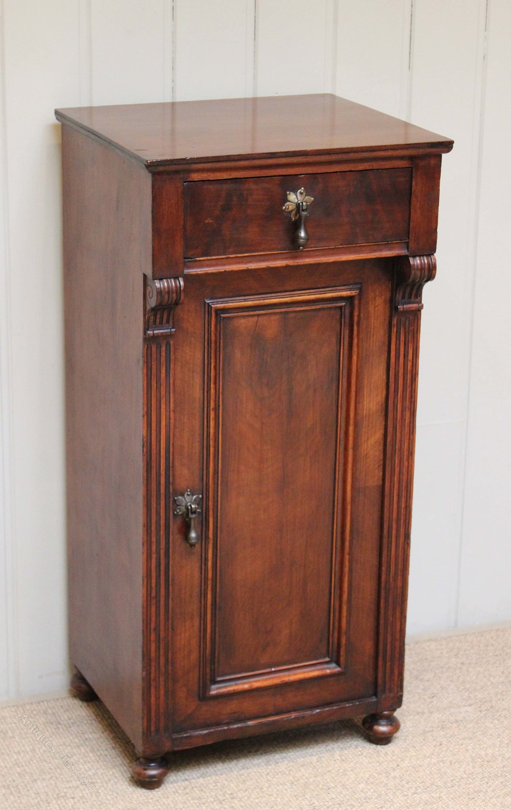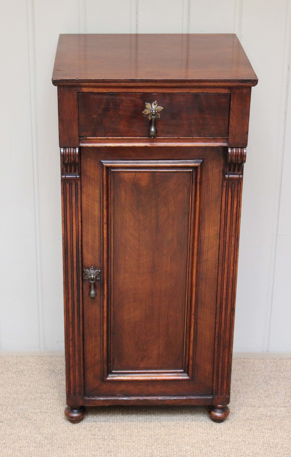 Mahogany bedside cabinet having a single drawer above a cupboard base with reeded edges and bun feet