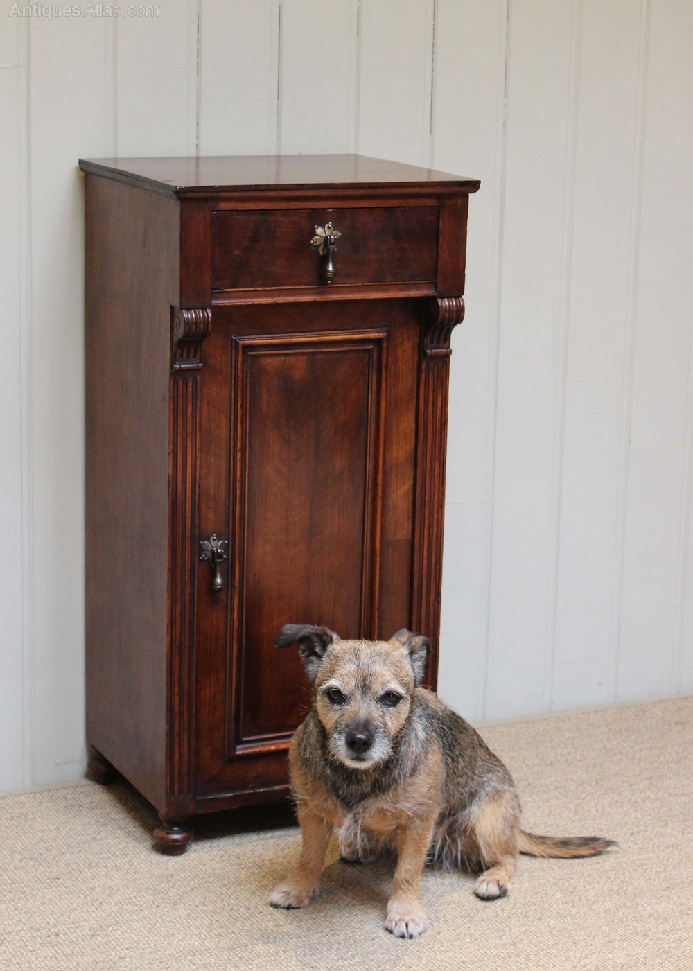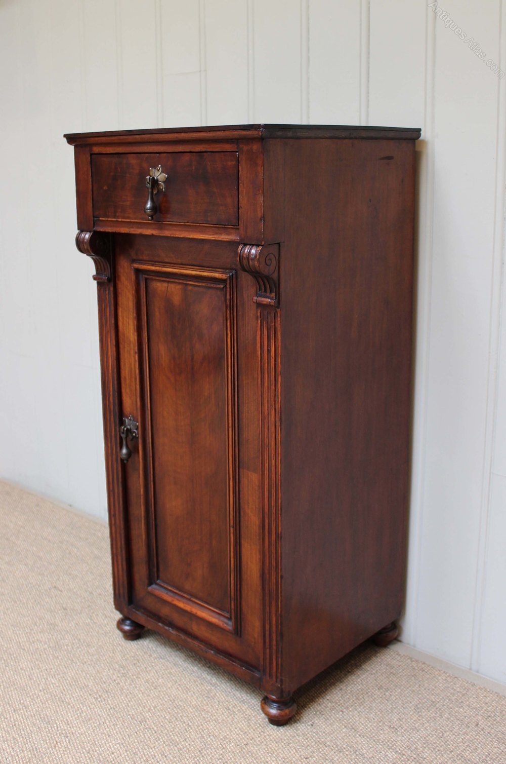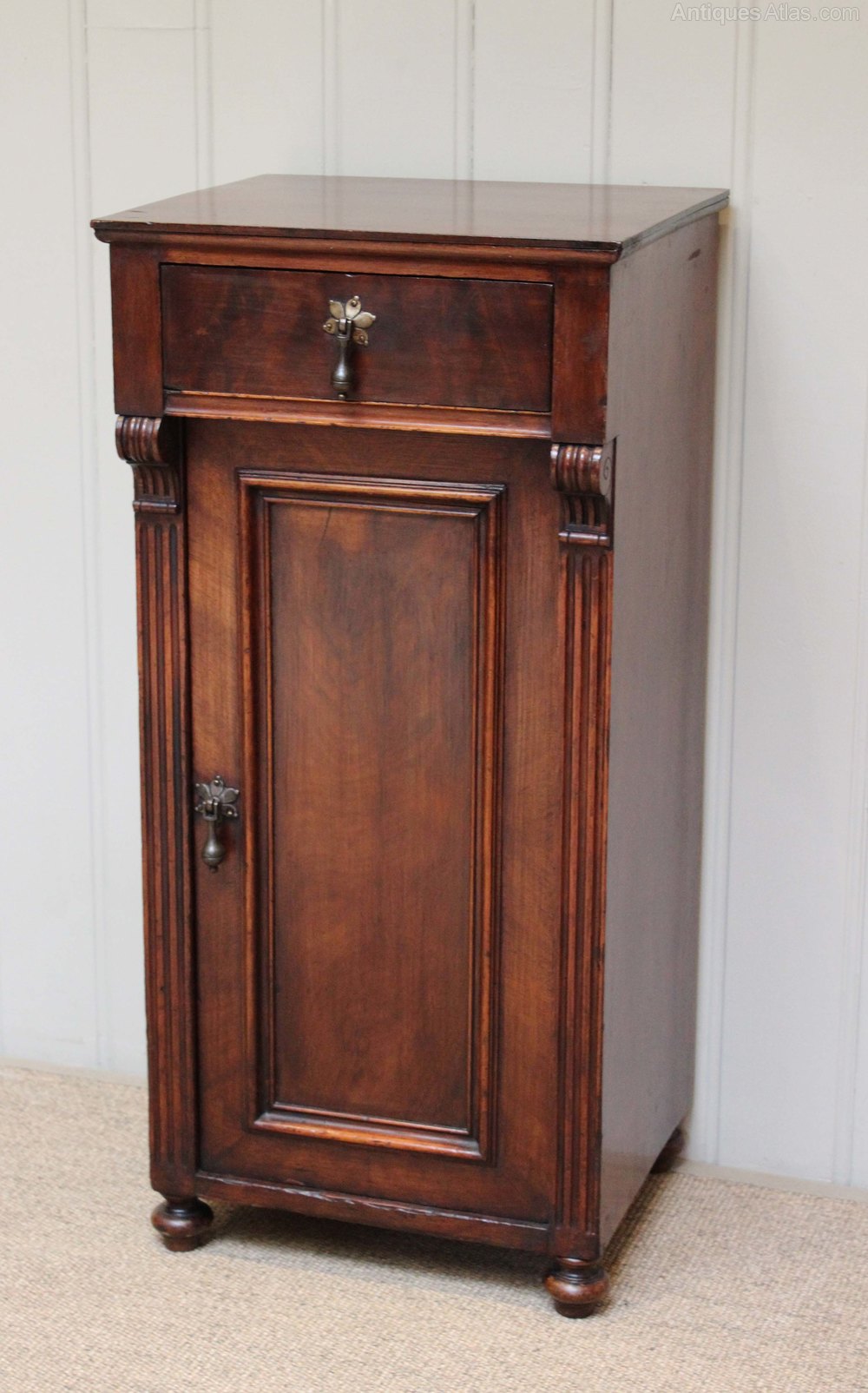 Mahogany bedside cabinet having a single drawer above a cupboard base with reeded edges and bun feet