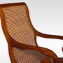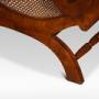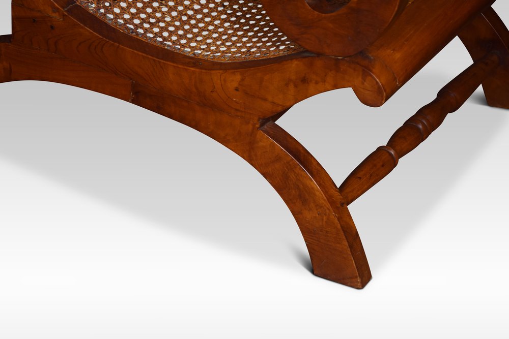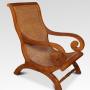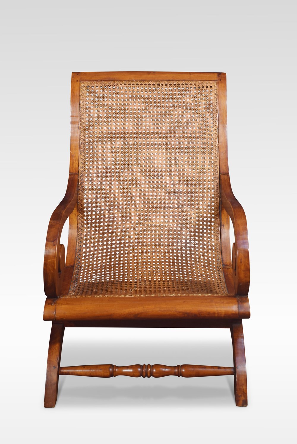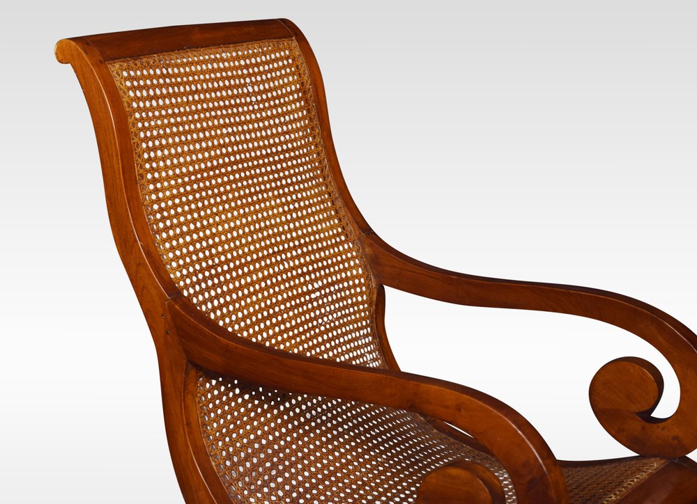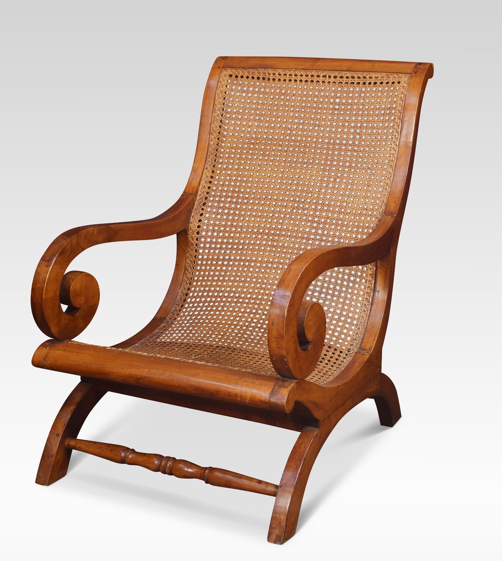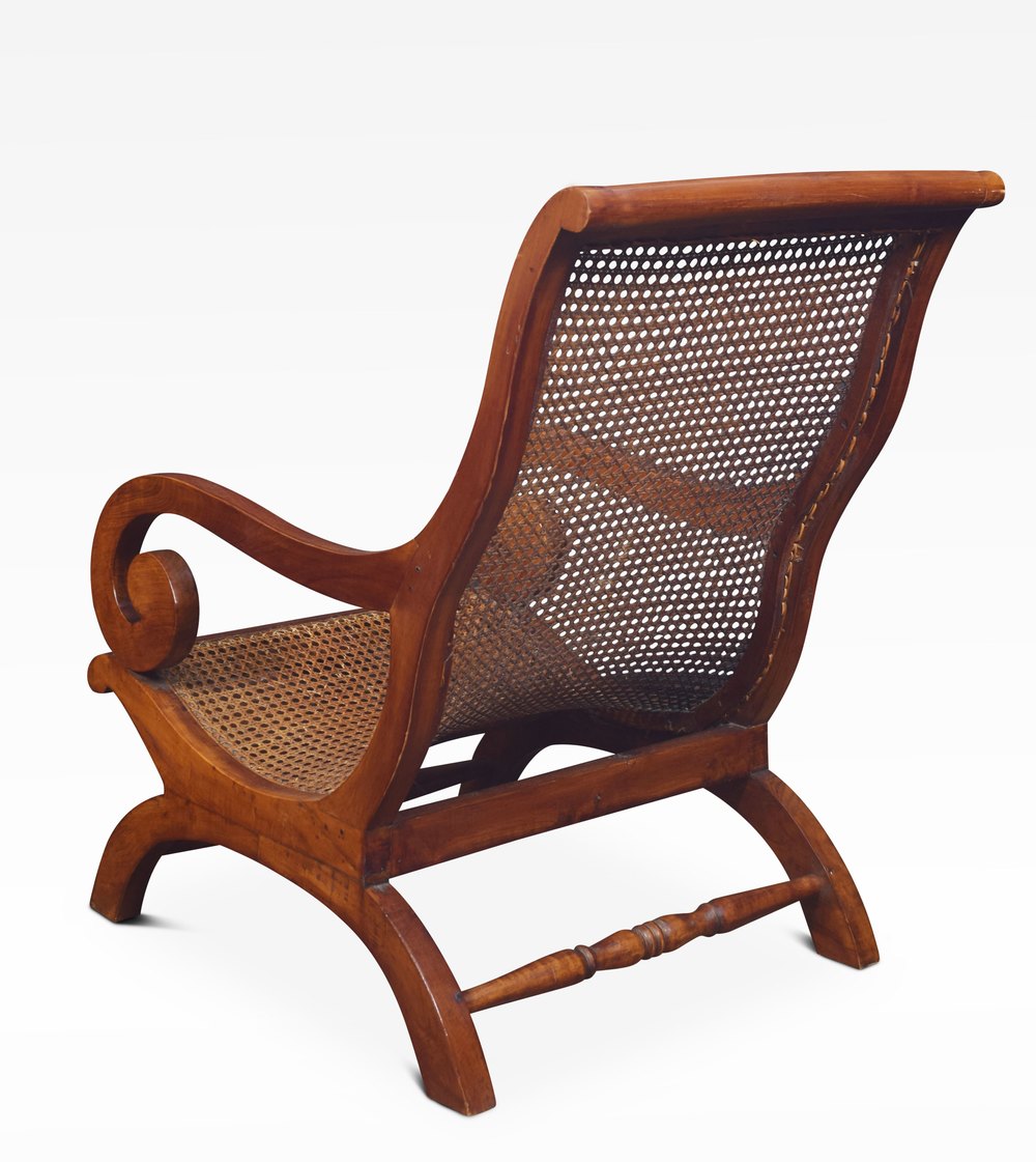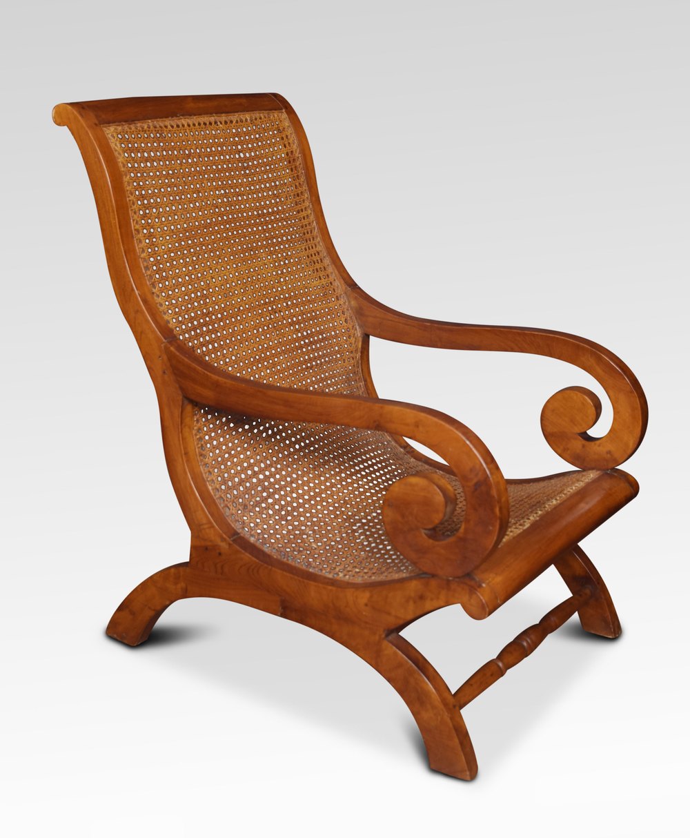 Mahogany framed library chair the shaped back with inset berger back and seat enclosed by scrolling arms. All raised up on shaped supports united by stretchers.