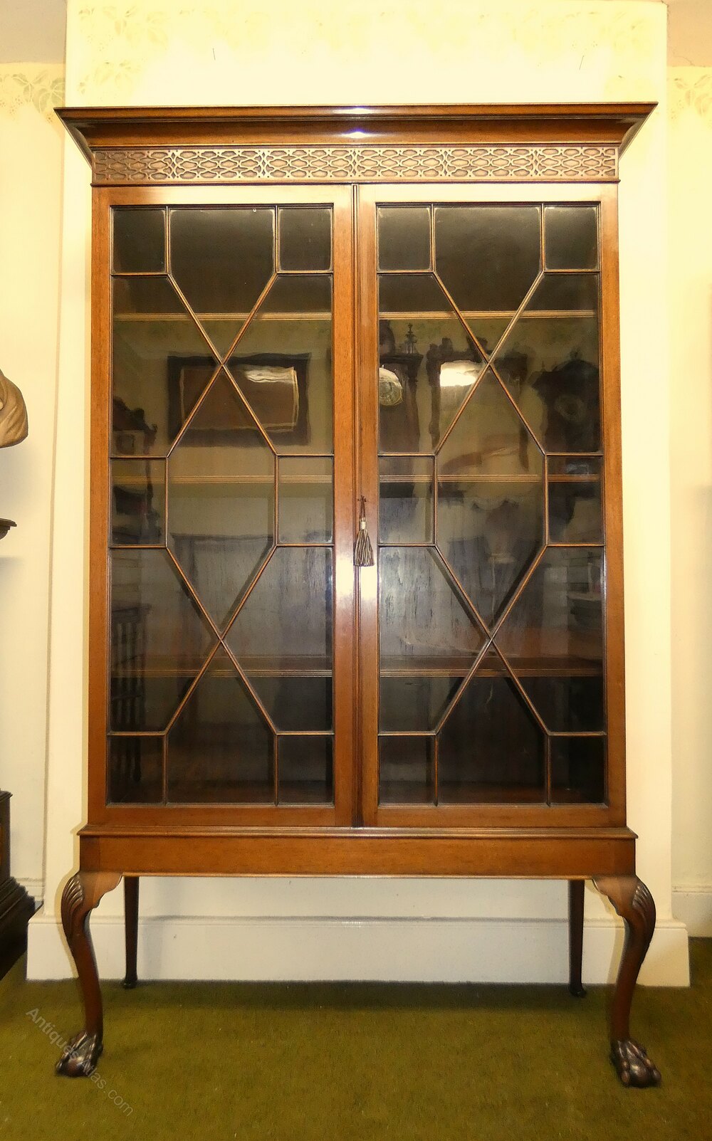 This elegant bookcase has a flared cornice with blind fret detail to the frieze, a pair of astragal glazed doors opening to an interior with adjustable shelves, raised on cabriole legs with carved shell details and substantial ball and claw feet.