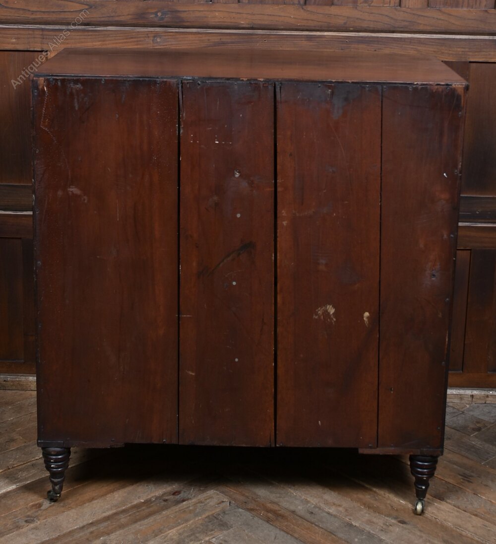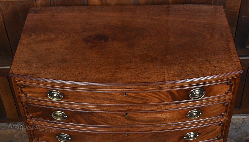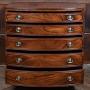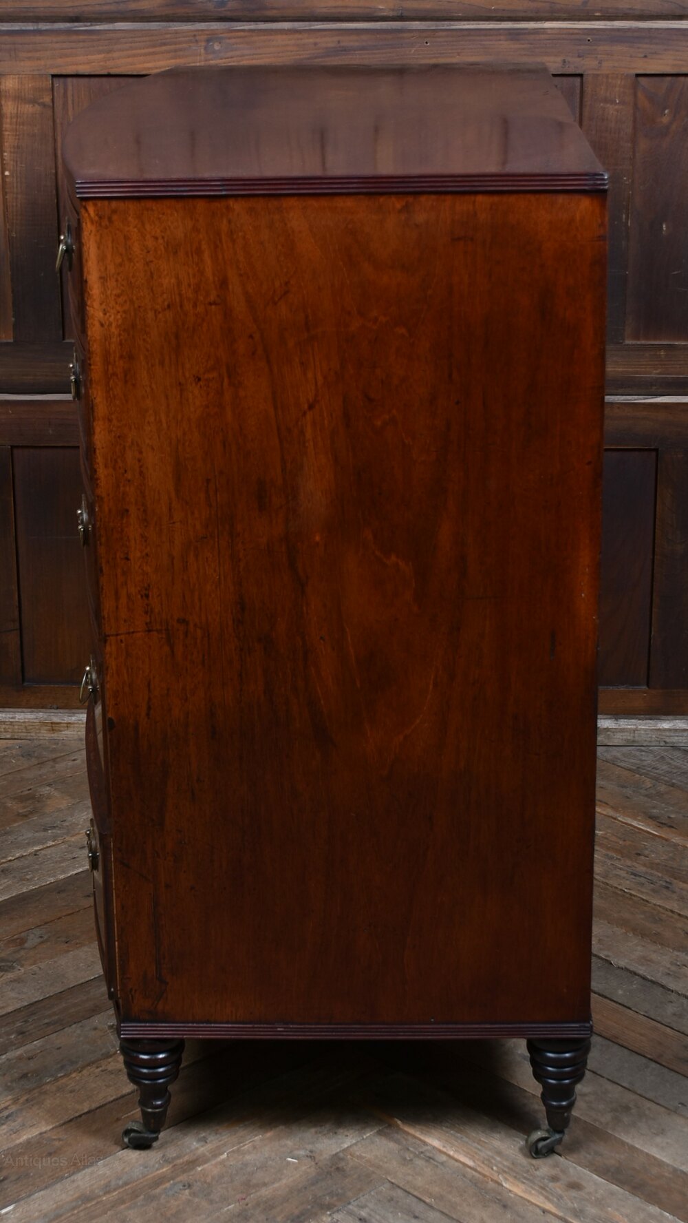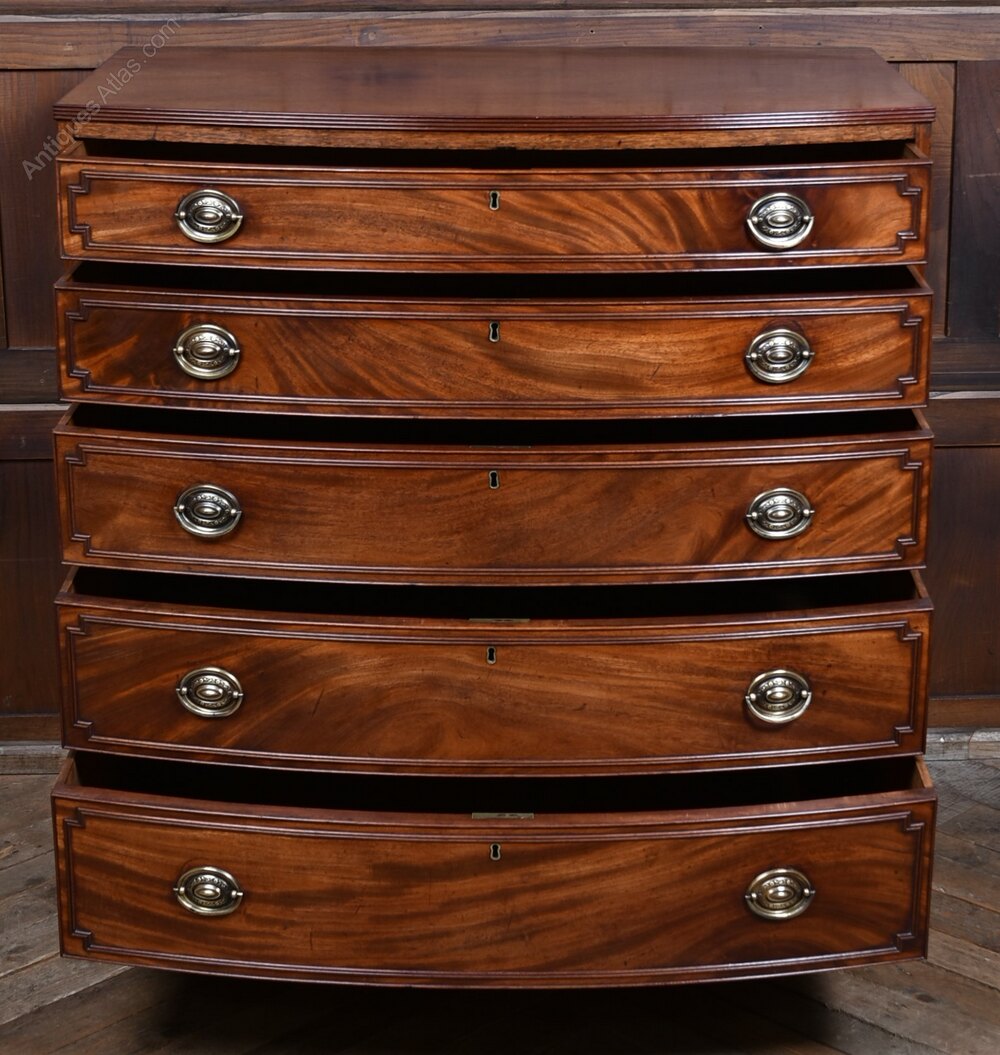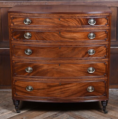 A handsome early–mid 19th‑century mahogany bow‑front chest of drawers in wonderful antique condition. The drawer fronts are veneered in well‑figured mahogany, and fitted with elegant brass embossed oval backplate handles. The graduated arrangement offers excellent storage, each drawer running smoothly and closing neatly. The chest stands on turned legs with brass cup castors. As with all genuine antiques, there are minor imperfections, but this remains a solid, well‑made chest with many years of use ahead of it.