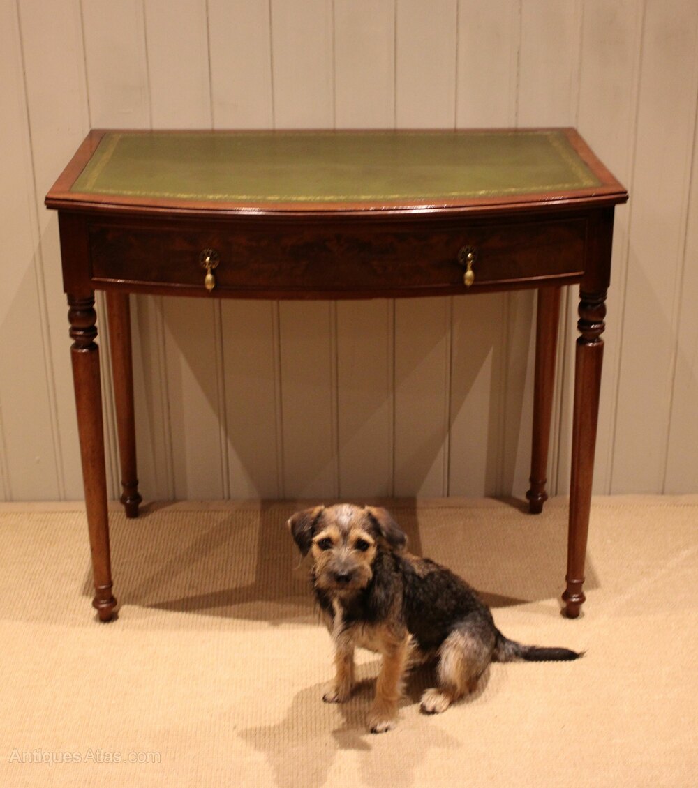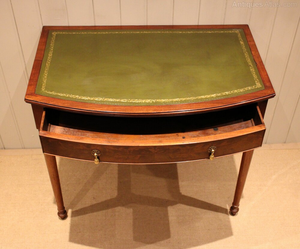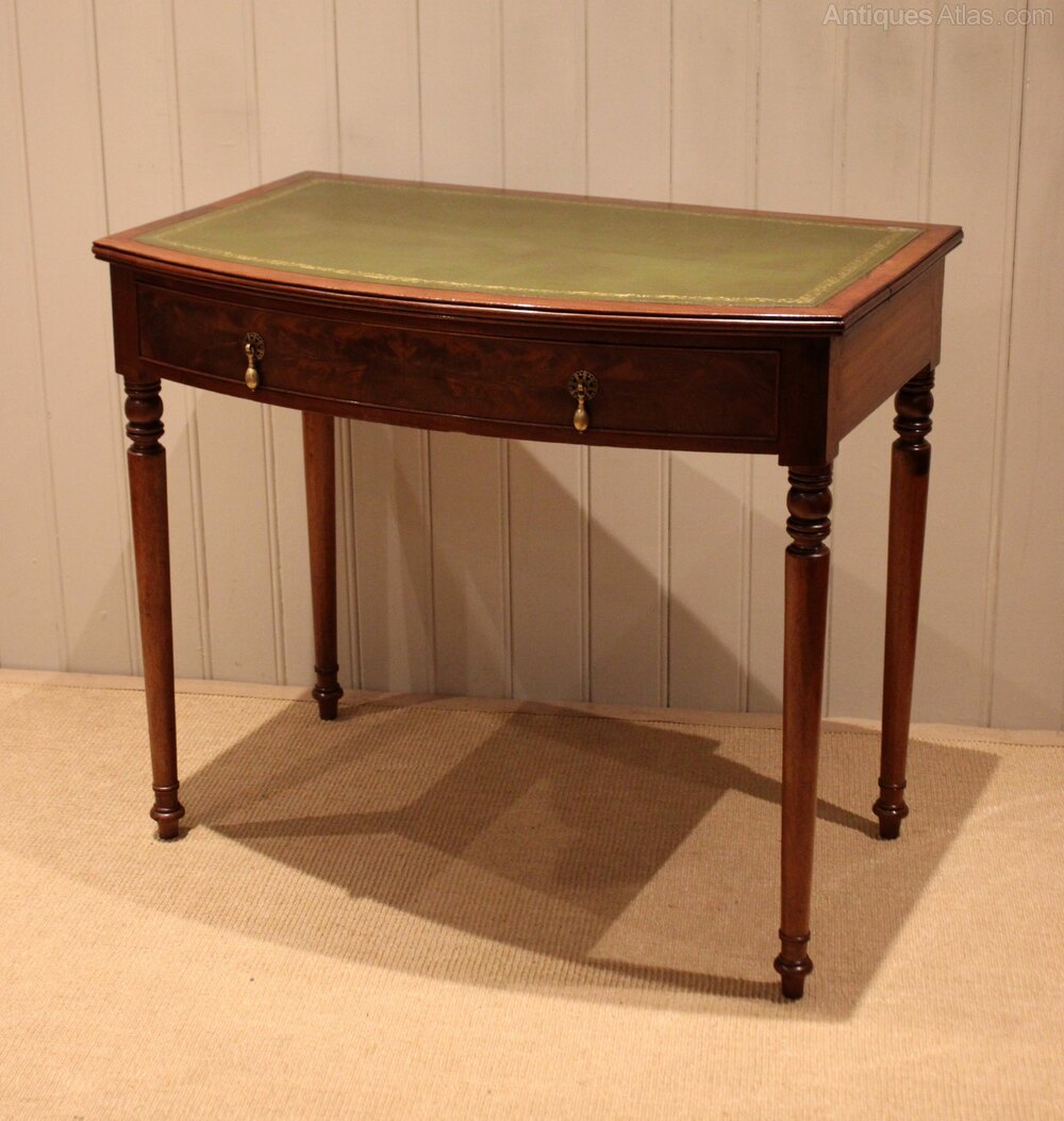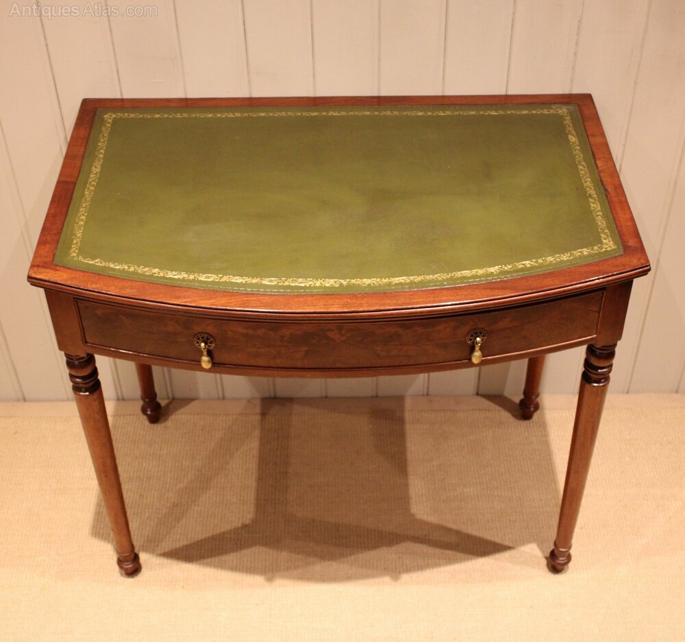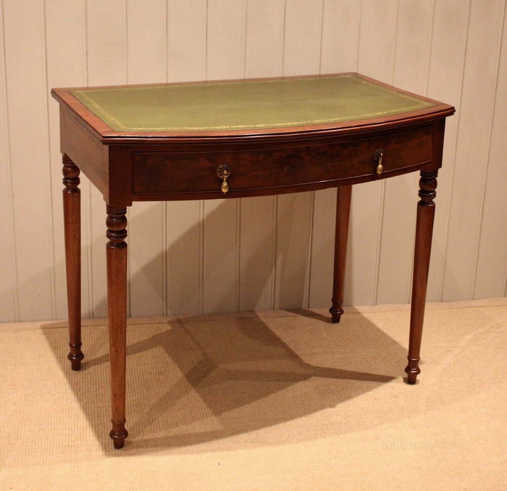 Mahogany bow front writing desk having a green tooled leather top , above a single drawer , raised on turned tapering legs .