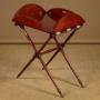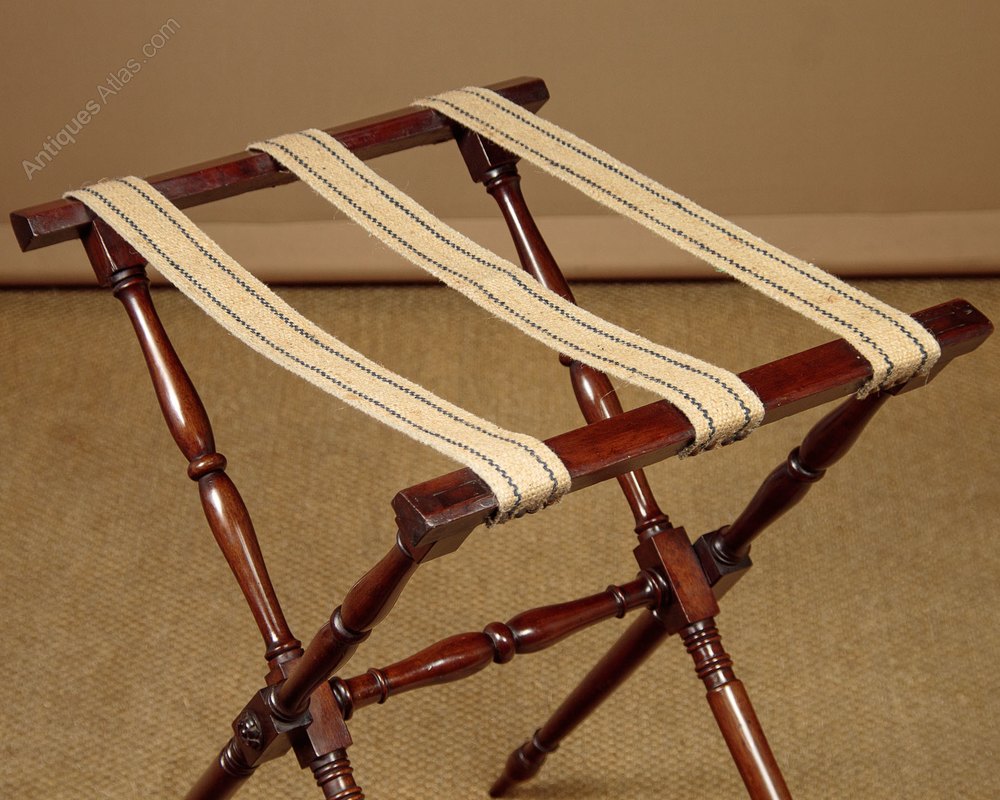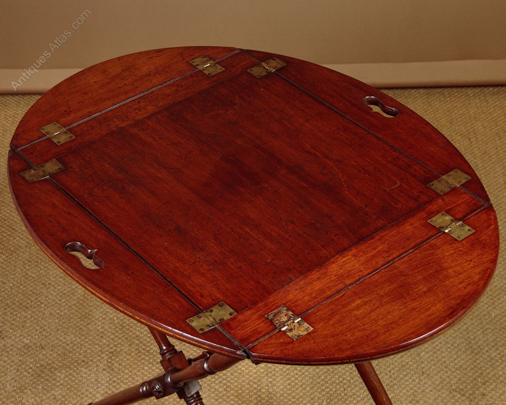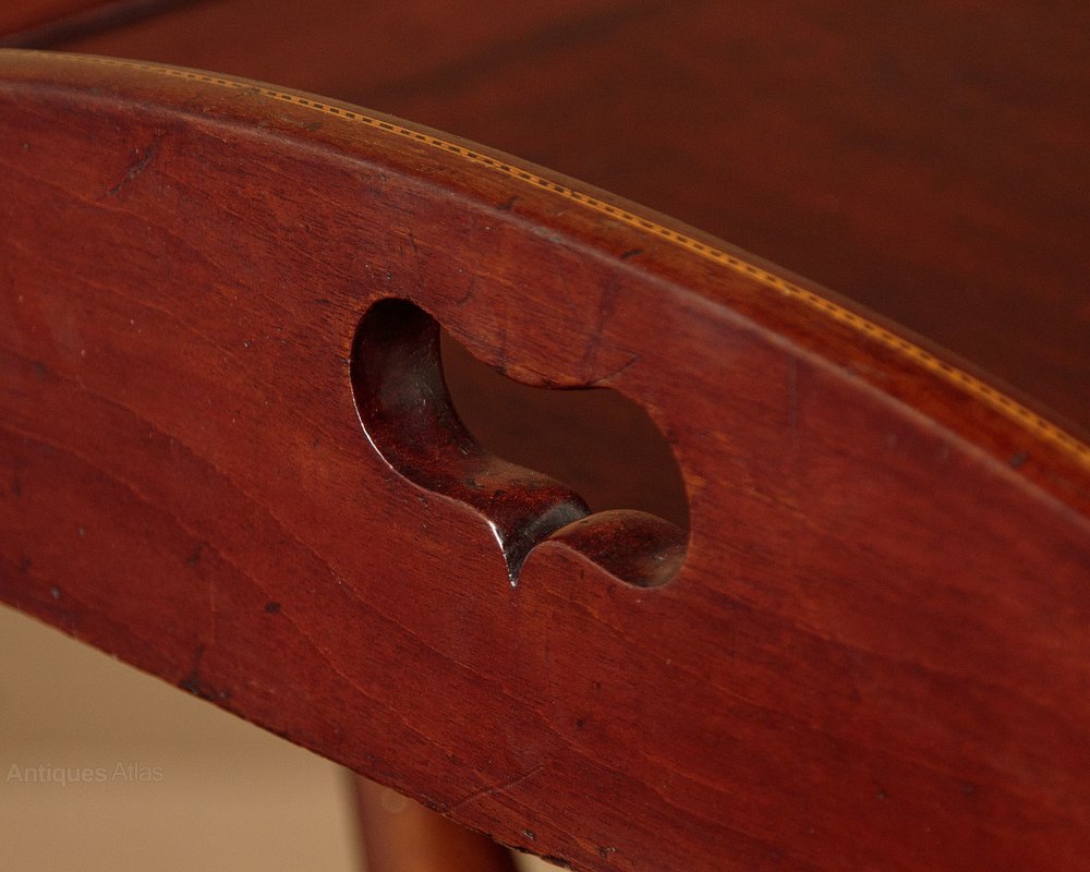 Mahogany butler’s tray on stand c.1900 . 27" x 21" tray with inlaid stringing to the edge, attractively shaped pierced grips on the long sides and brass hinges, allowing the sides to fold flat to make an oval table (38" x 28") or to be stored flat when not in use. Folding mahogany stand crisply turned legs and stretcher and tapering feet. Wear to the hinges means the shorter sides tend to drop slightly inwards rather than standing straight when raised. Otherwise excellent condition and colour. Cleaned and waxed in our workshops and fitted with new webbing.