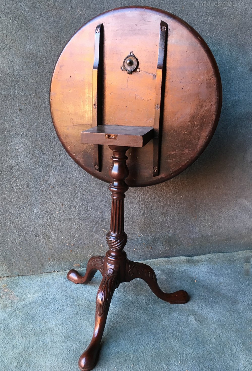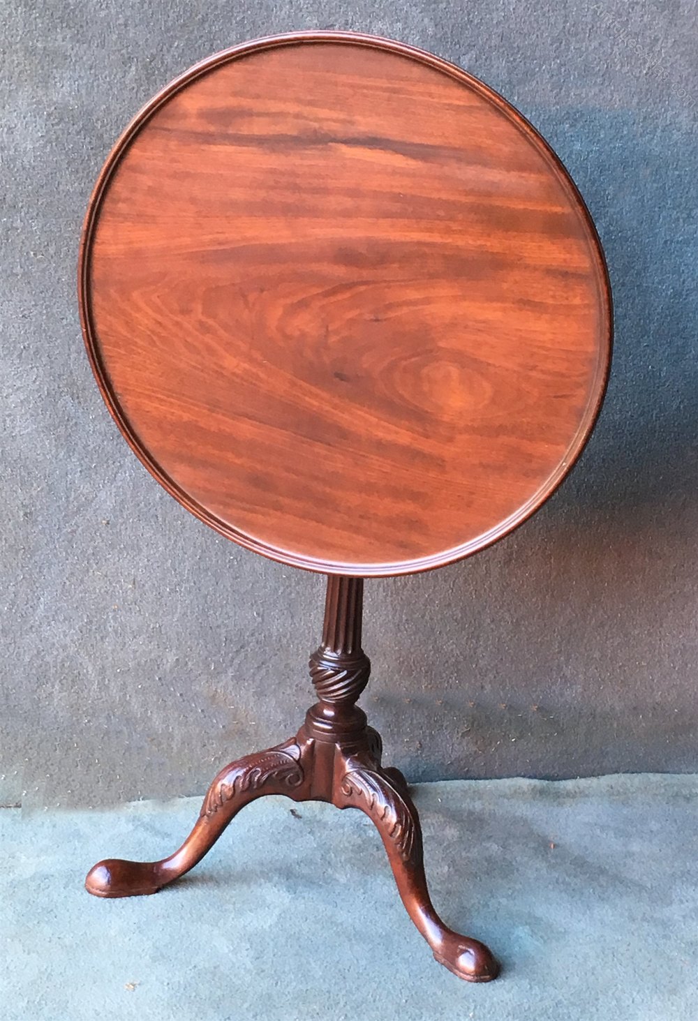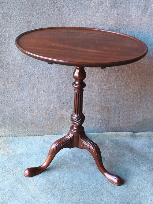 A beautiful mahogany dish turned, tilt top tripod table. The centre column is turned with a carved fluted vase and stem. The swept down legs have acanthus leaf carving on the knees.