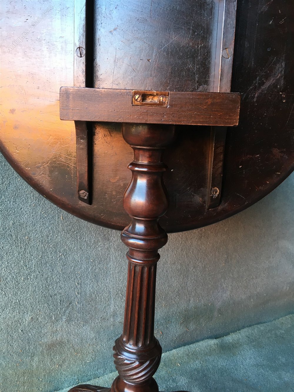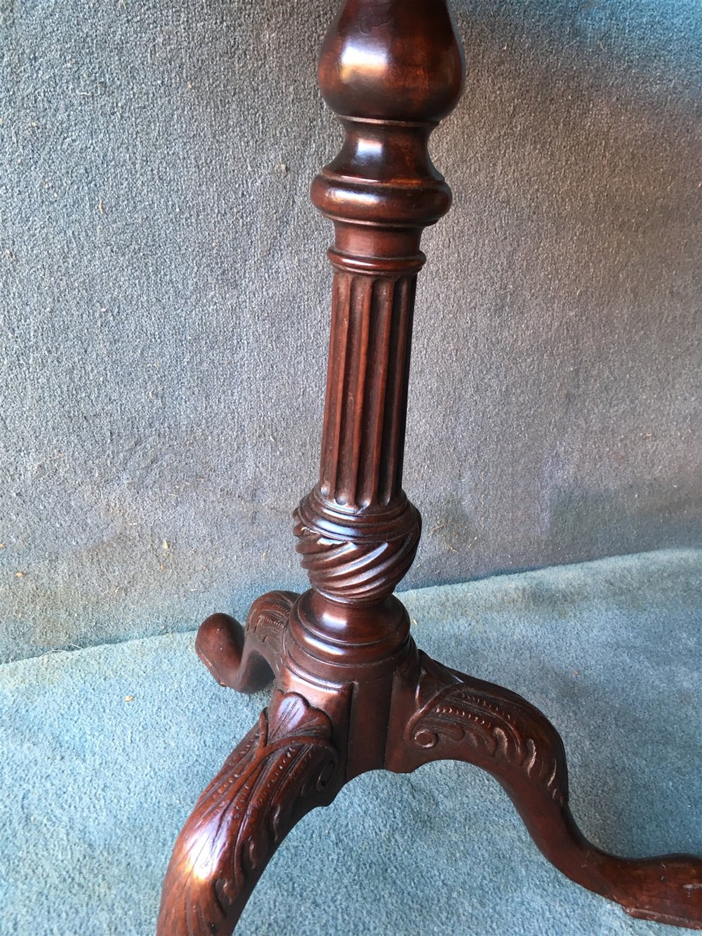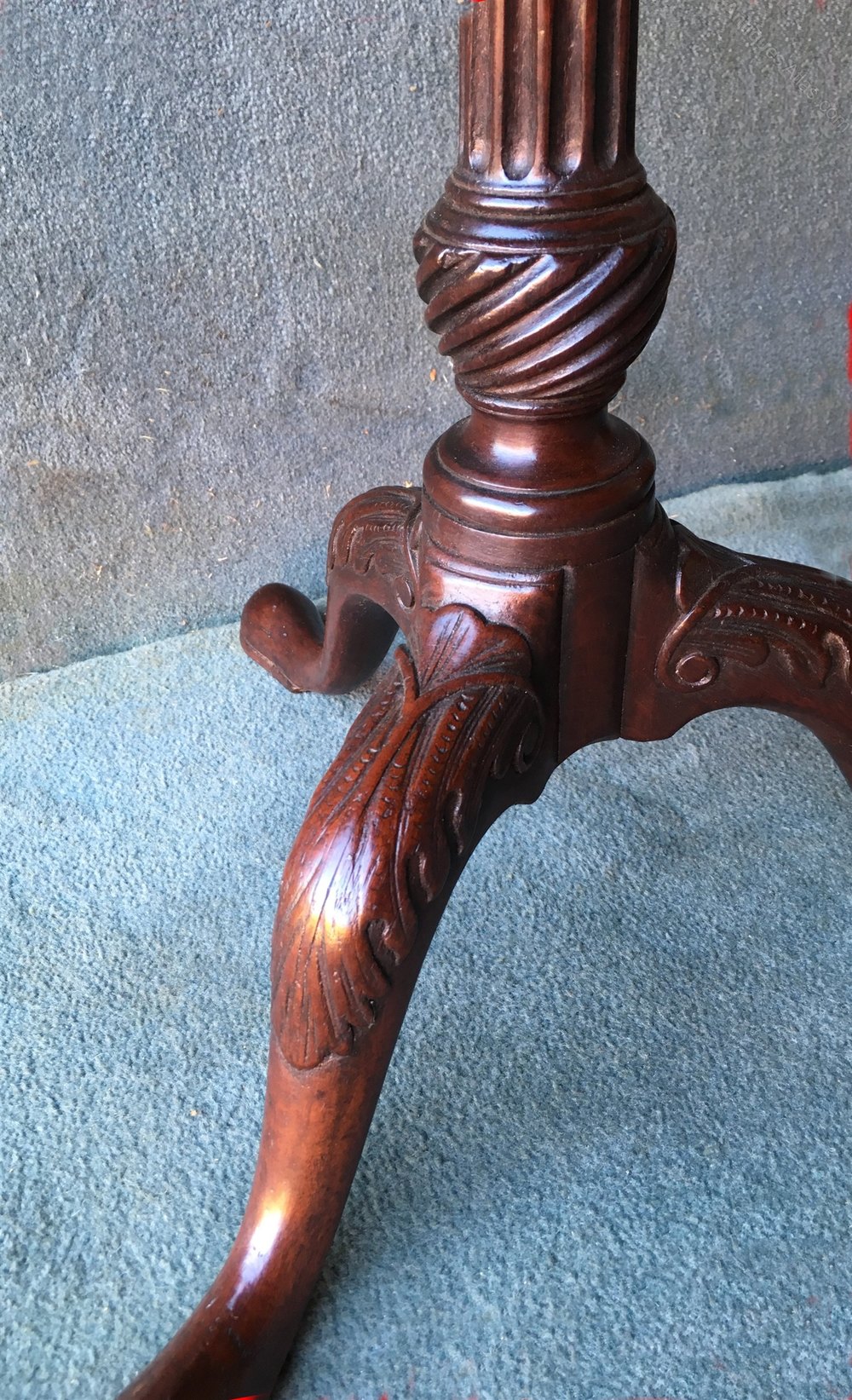 A beautiful mahogany dish turned, tilt top tripod table. The centre column is turned with a carved fluted vase and stem. The swept down legs have acanthus leaf carving on the knees.