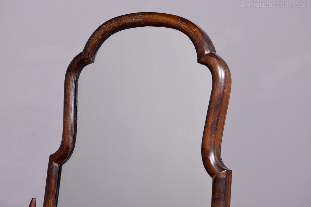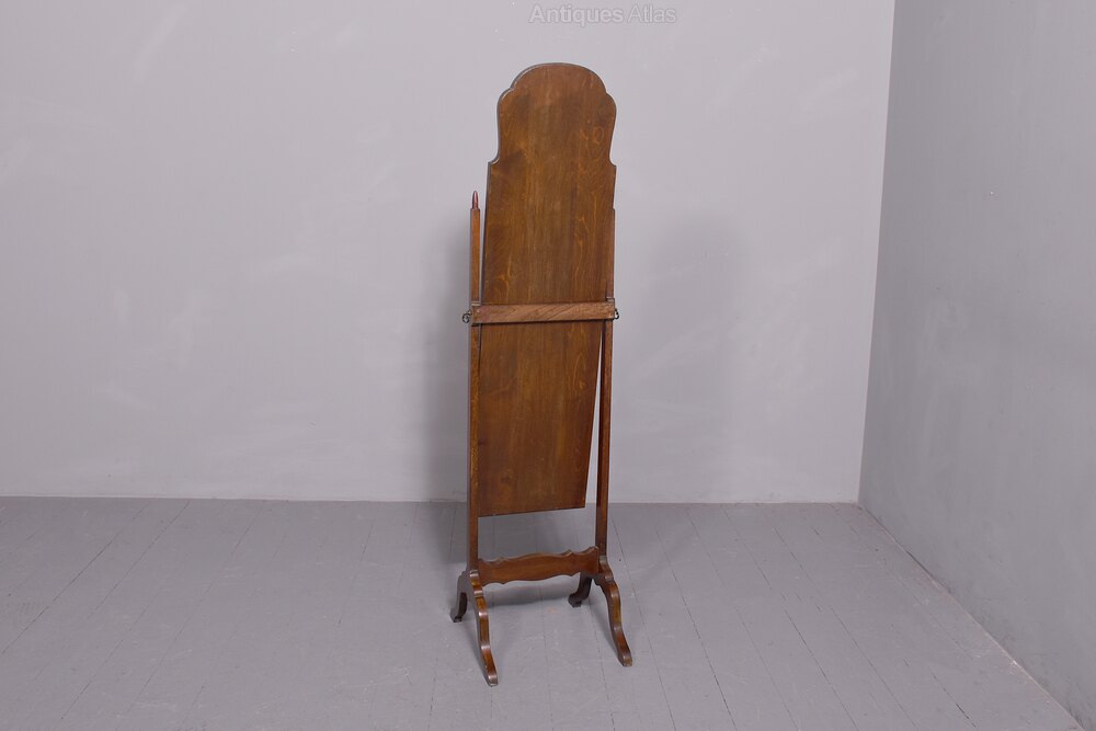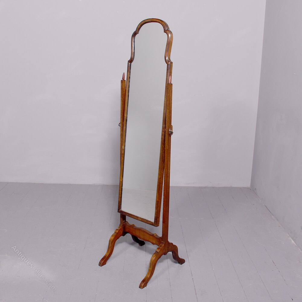 Circa 1930s. A Queen Anne style mahogany framed cheval mirror, the stylish shaped frame with rounded fore-edge, the mirror held in place by two tapering uprights surmounted by very elegant urn shaped finials, the frame held in position by a pair of cast brass axe-head drops, beneath the mirror is a shaped stretcher bracing the two uprights, all resting on four downward facing cabriole legs.