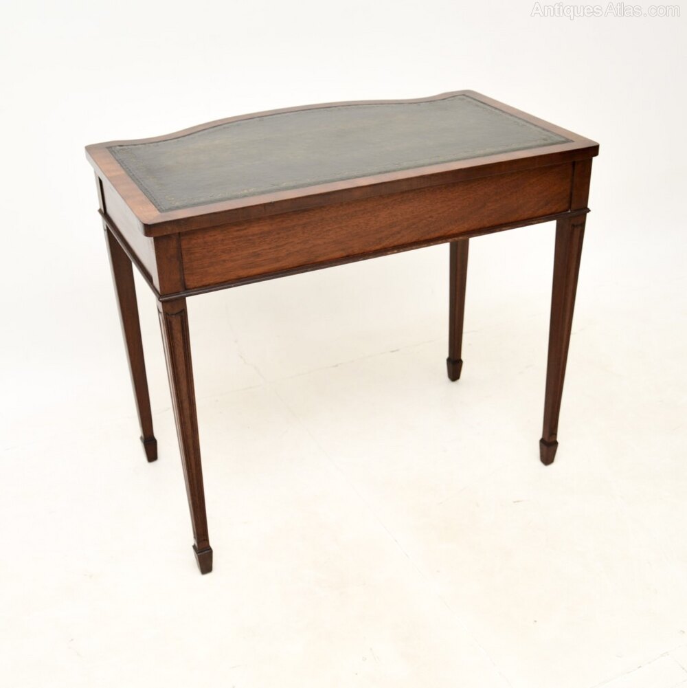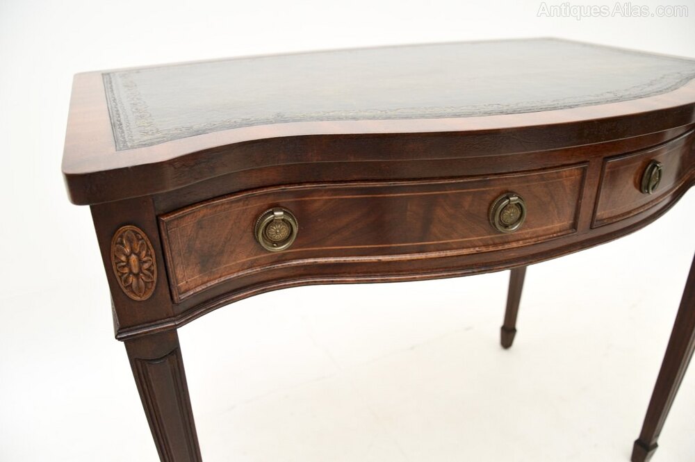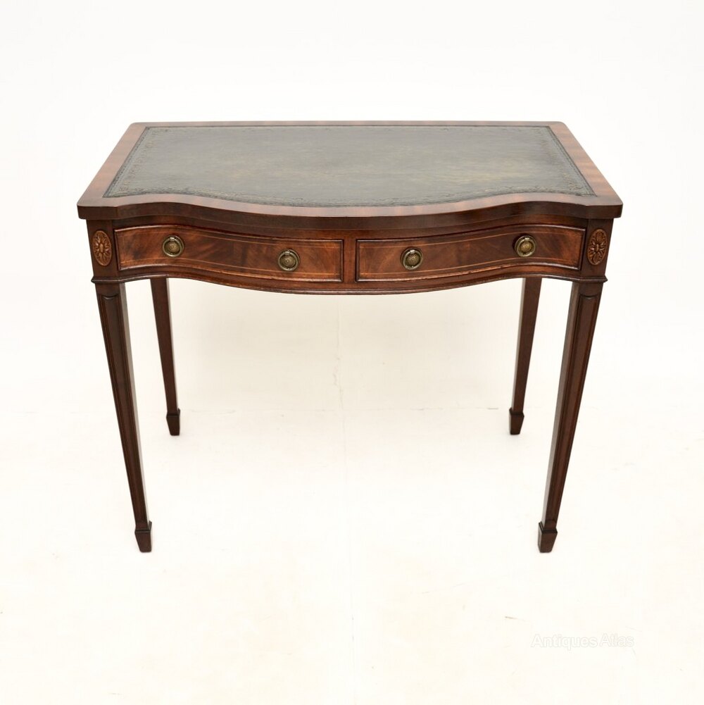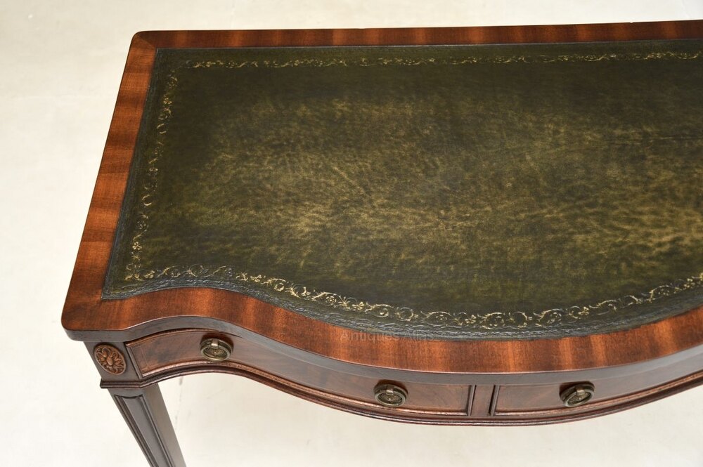 The quality is superb and this is a very practical size, perfect for use as either a desk or a console table. There is a lovely inset leather top, this has a serpentine shaped front and stands on tapered legs.