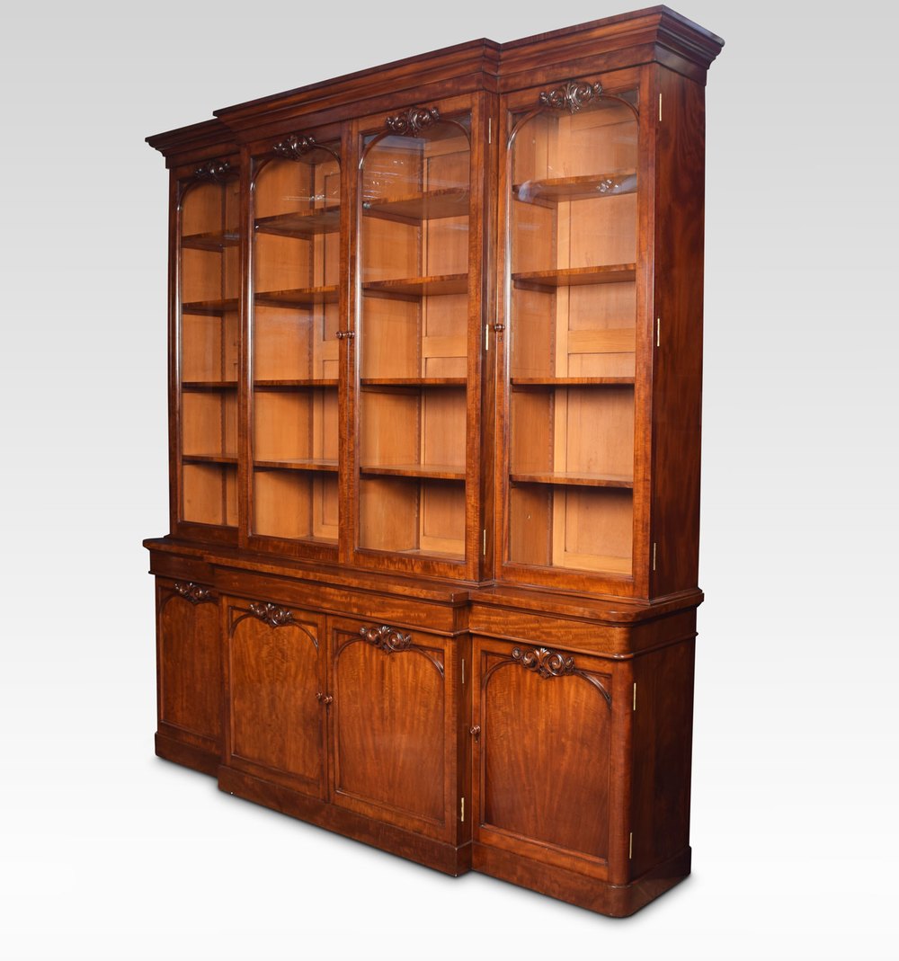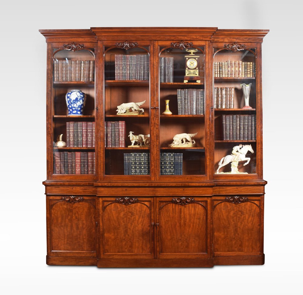 Early Victorian mahogany library breakfront secretaire bookcase by W Turner & Son Liverpool. The stepped and moulded cornice above the four upper glazed doors, opening to reveal adjustable shelves. The base with two central draws one fitted with secretere with original tooled leather writing surface flanked by short draws to either side above four panelled doors with foliated carvings opening to reveal a shelved interior. The whole bookcase raised up on plinth base. (This bookcase will separate into five pieces for easy transportation)