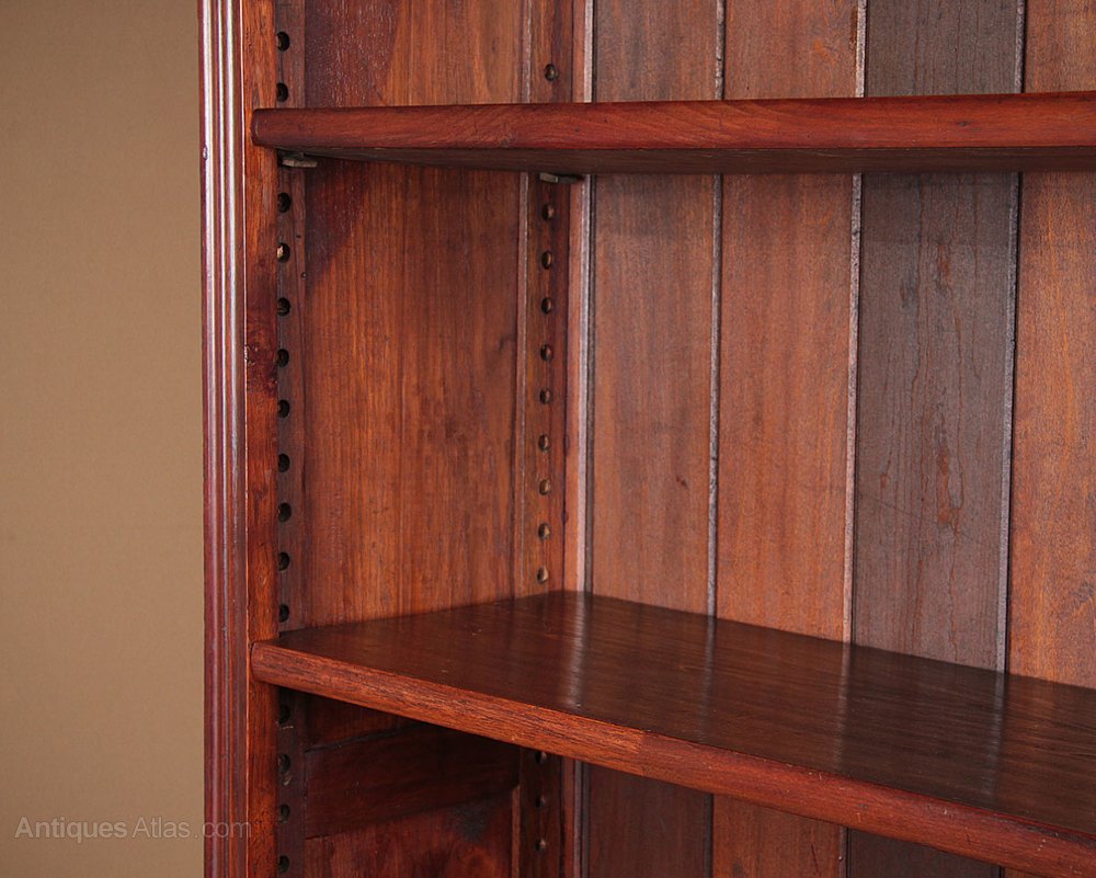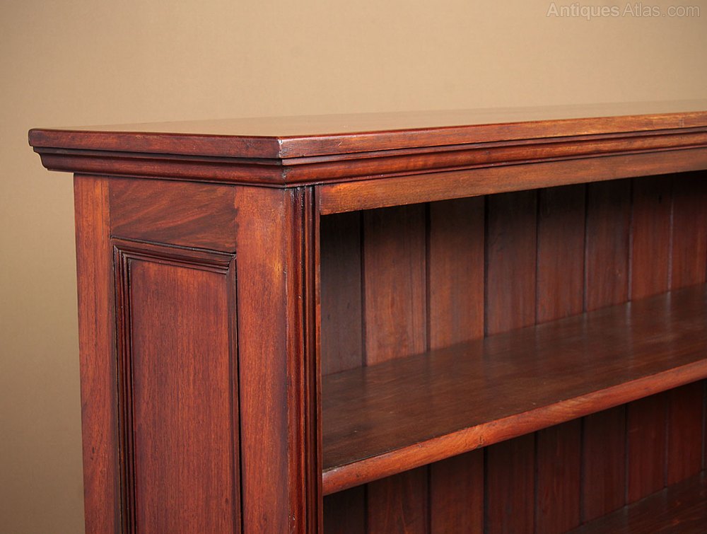 Good quality Edwardian mahogany open bookcase c.1910. Four feet wide and standing 53″ tall it is a little larger than many we see. Solid mahogany top with an applied moulding below. Over an open bookcase with three adjustable shelves (depth 10″) and flanked with reeded uprights. Solid mahogany sides with moulded detail around the panels. raised on a moulded plith. Hardwood shelves and backboards. Excellent colour and condition, cleaned and polished in our workshops.