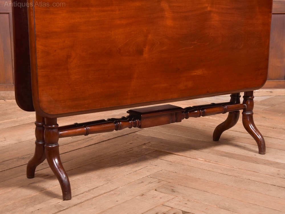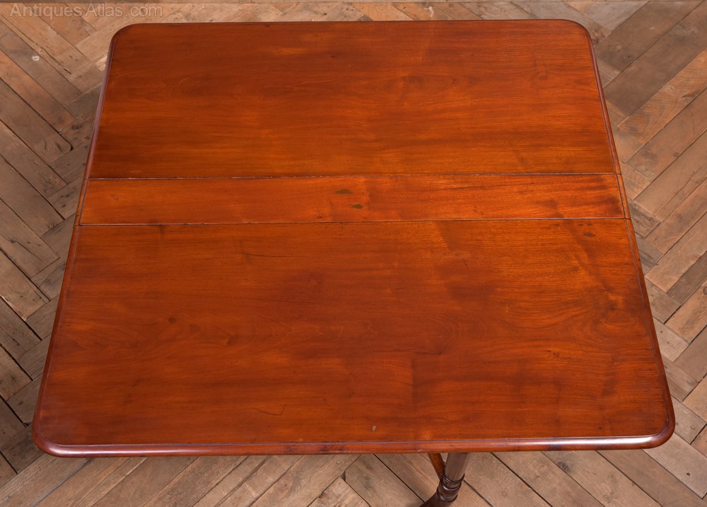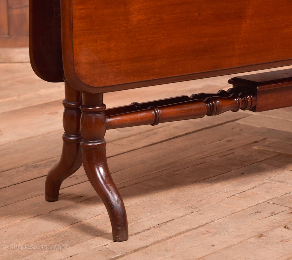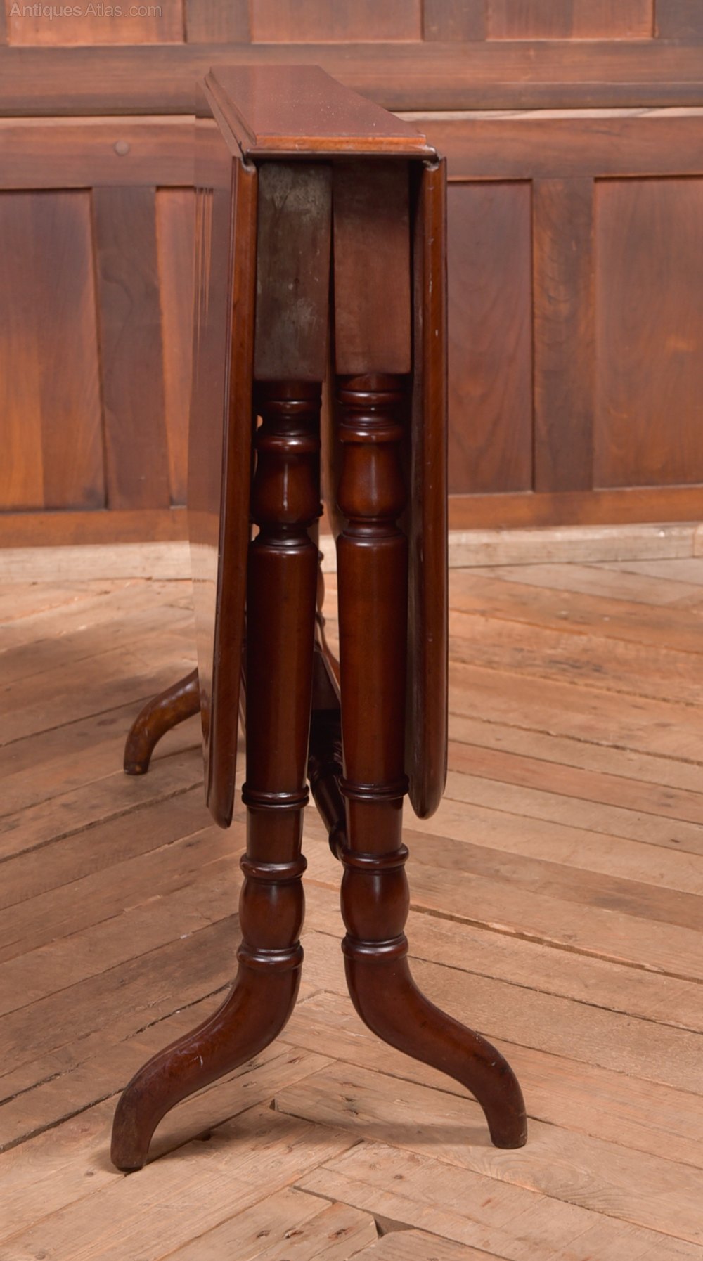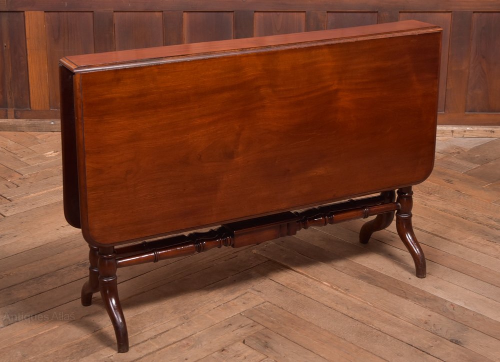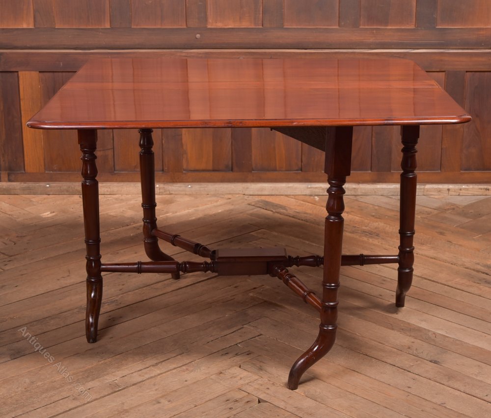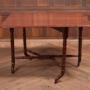 Superb quality double gate leg mahogany Sutherland table. Solid leaves with a thumb moulded edge over 4 elegant turned legs joined with turned hinged stretchers (an unusual design detail). Ideal for a small property, makes useful supper table but folds down to a very narrow profile when not in use.