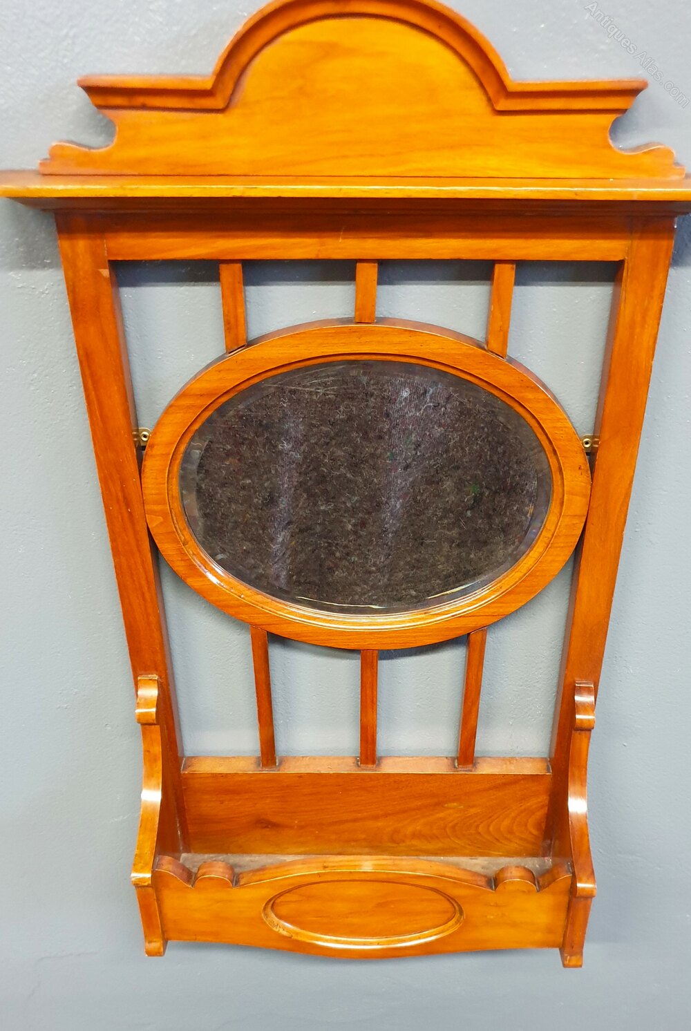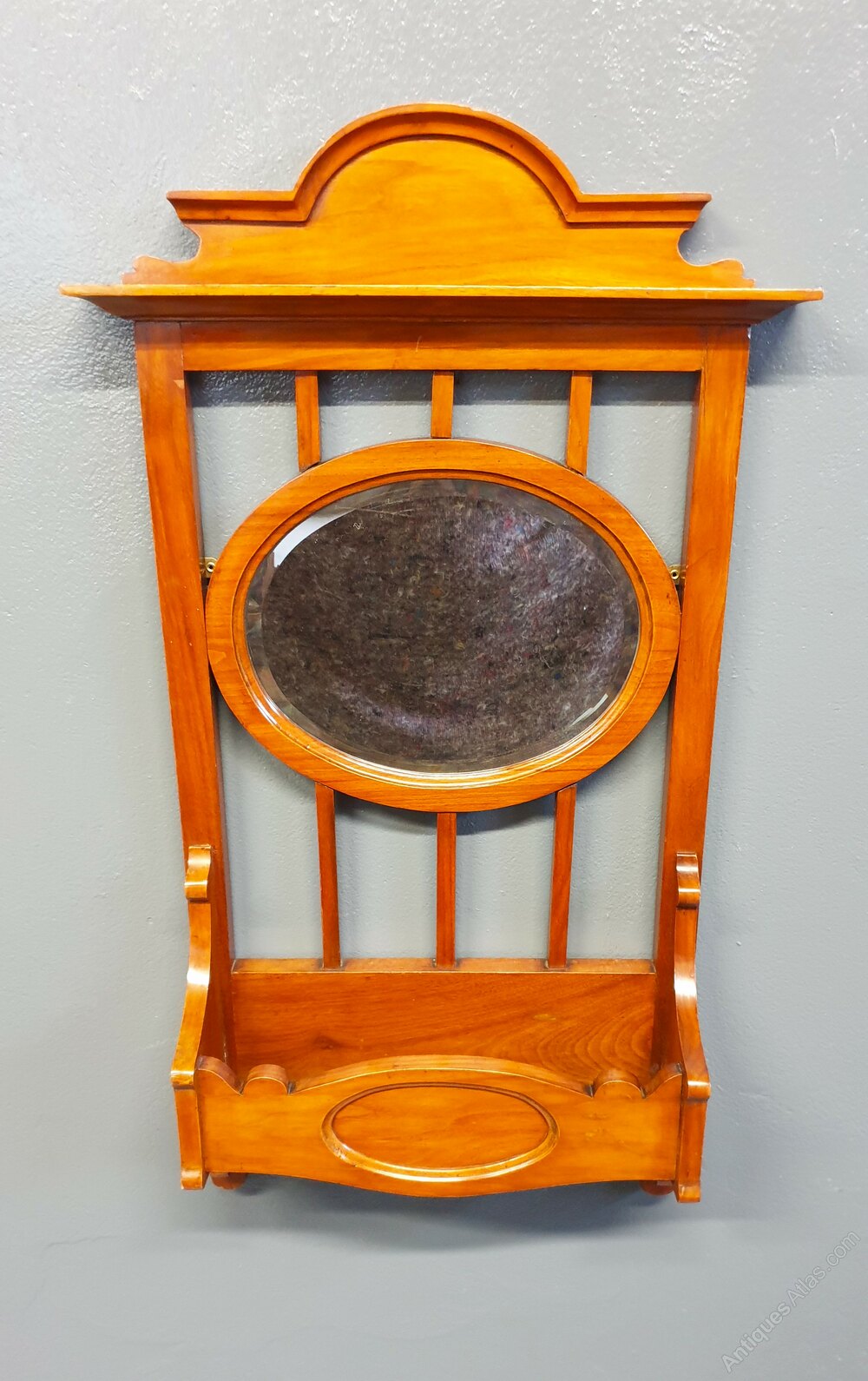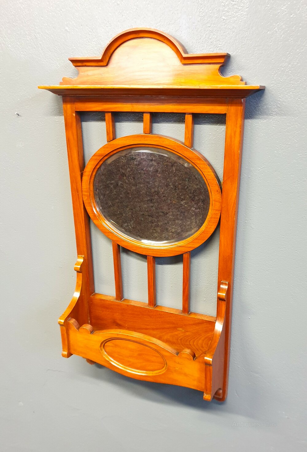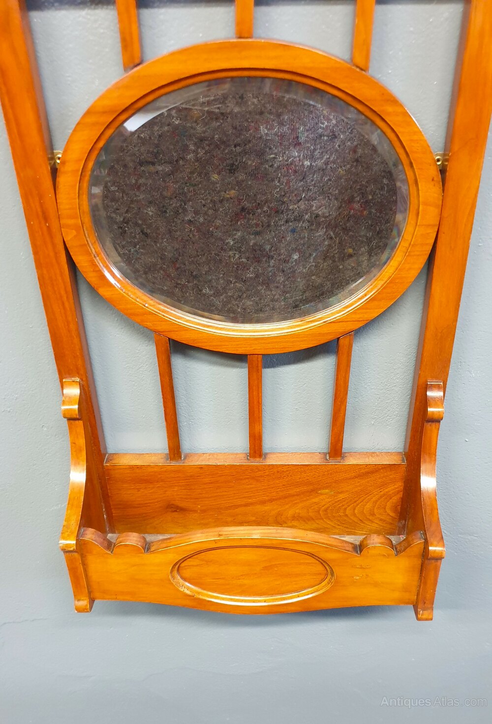 A stunning Mahogany wall mirror having a inset bevelled glass oval mirror and glove pocket below.