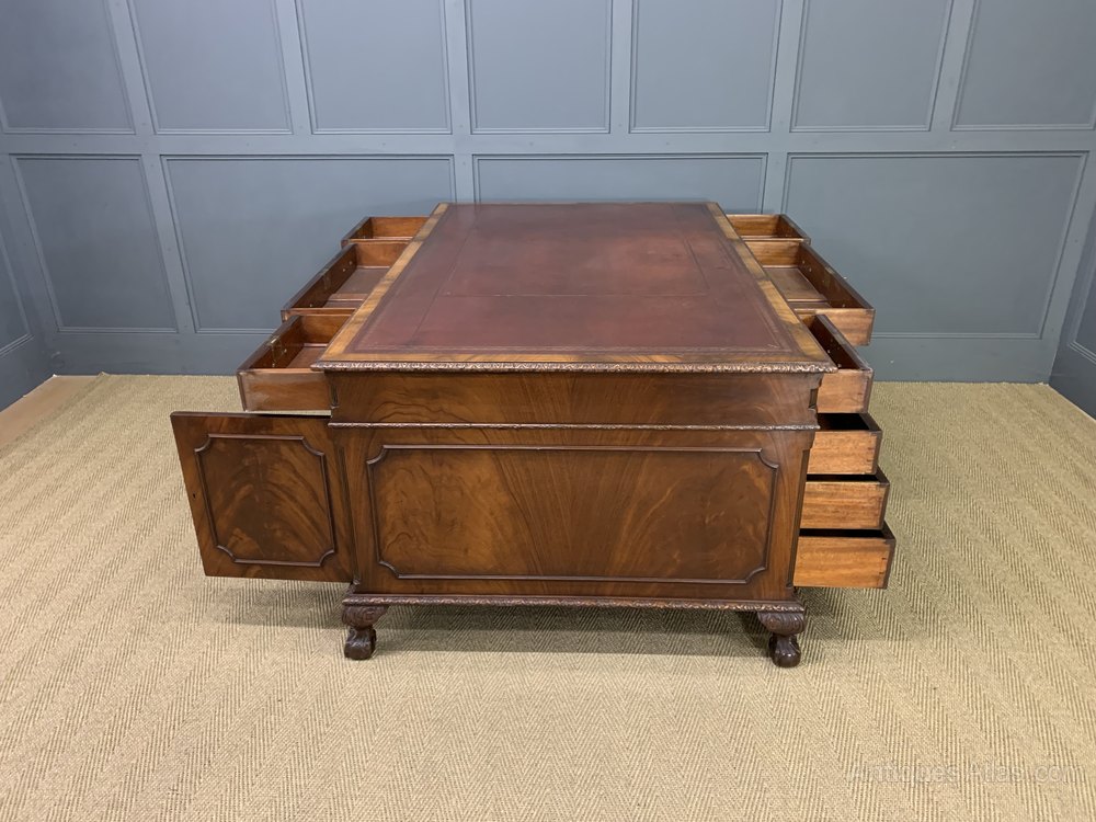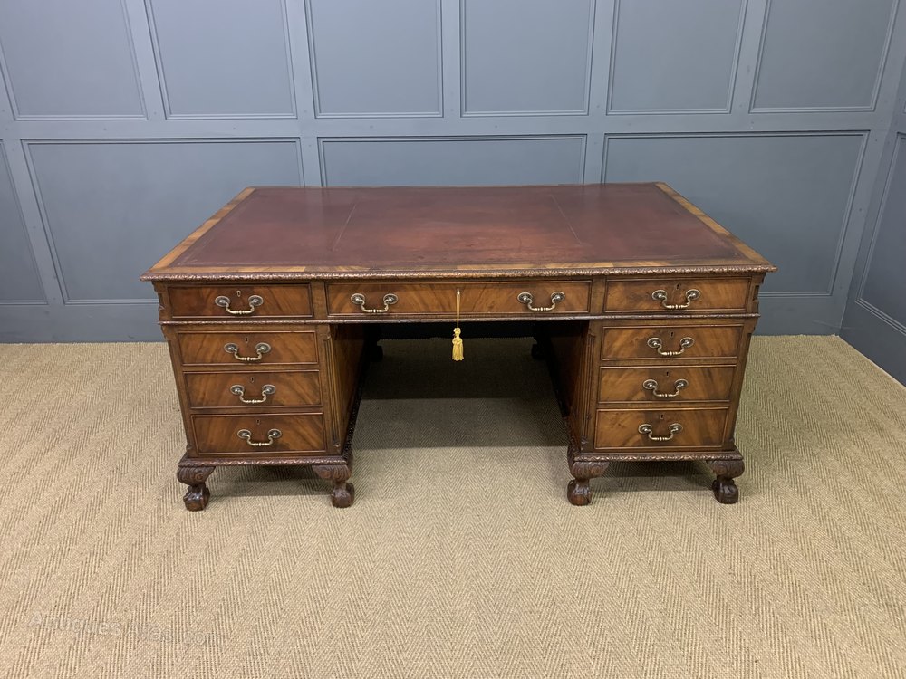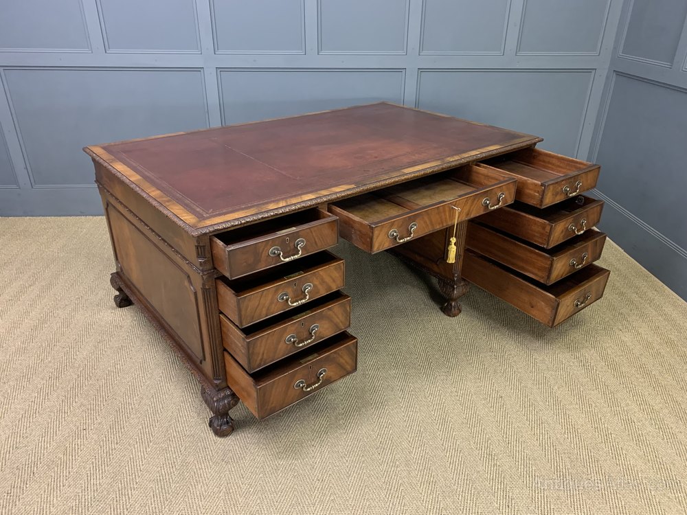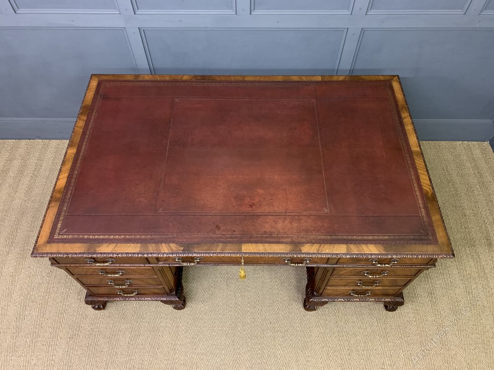 A bold and impressive mahogany Chippendale style partners pedestal desk by Maple and Co of London. Of generous proportions and well constructed in solid mahogany with attractive flame mahogany veneers. The top fitted with a sumptuous leather writing surface complete with tooled decorations. The top surrounded with carved thumb nail moldings. The front of the desk with one long central drawer flanked by 2 pairs of 4 graduated shorter drawers. The reverse with 3 drawers and a pair of cupboards. All doors and drawers are lockable, keys supplied. All standing on squat ball and claw carved feet. Sympathetically refinished in our workshops and now offered for sale in excellent condition, with a good colour and patina. Splits into 3 sections for ease of installation.