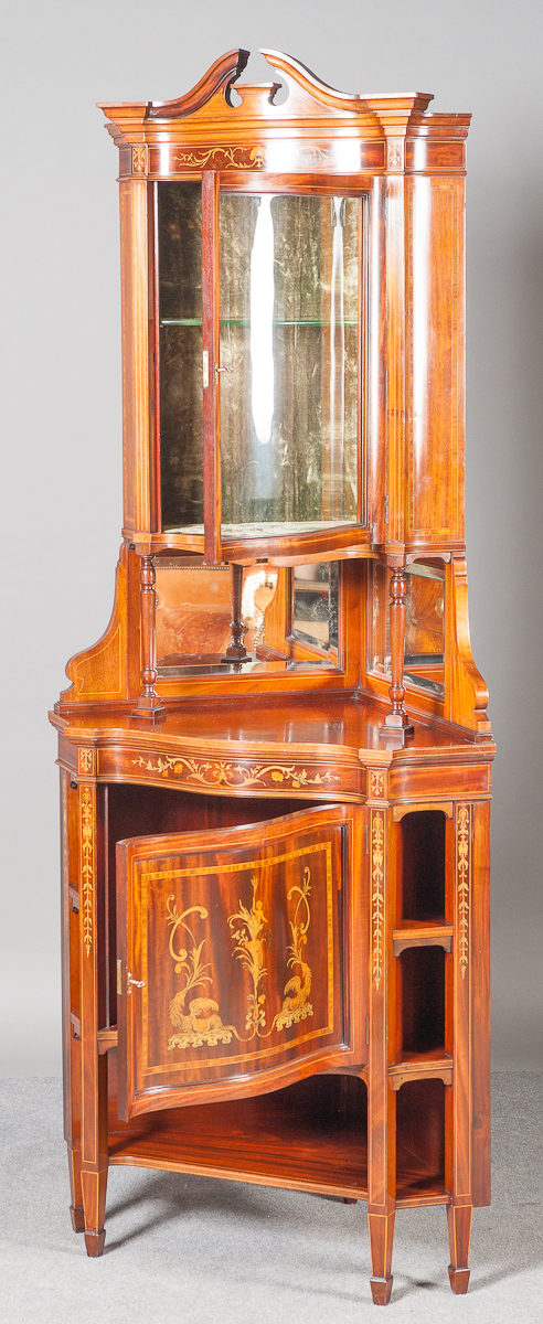 A good quality and attractive Sheraton Revival inlaid corner cabinet by Maples of London and Paris . Serpentine shaped front and sides with boxwood strung swan neck pediment and inlaid frieze below. The serpentine plate glass door with original crushed velvet lining and plate glass shelf interior. The open middle with bevelled edge mirrors with turned column and shaped bracket supports. The base with shaped and inlaid frieze and a wonderfully inlaid panelled door with griffins, putti and foliage in satinwood, boxwood and various stained woods, the panel framed with satinwood banding between boxwood and ebony stringing. To each side are 3 shelves for display and a larger shelf below. The whole with further boxwood stringing and satinwood banding standing on square tapering legs with spade feet. Bearing makers label. With brass locks and keys.