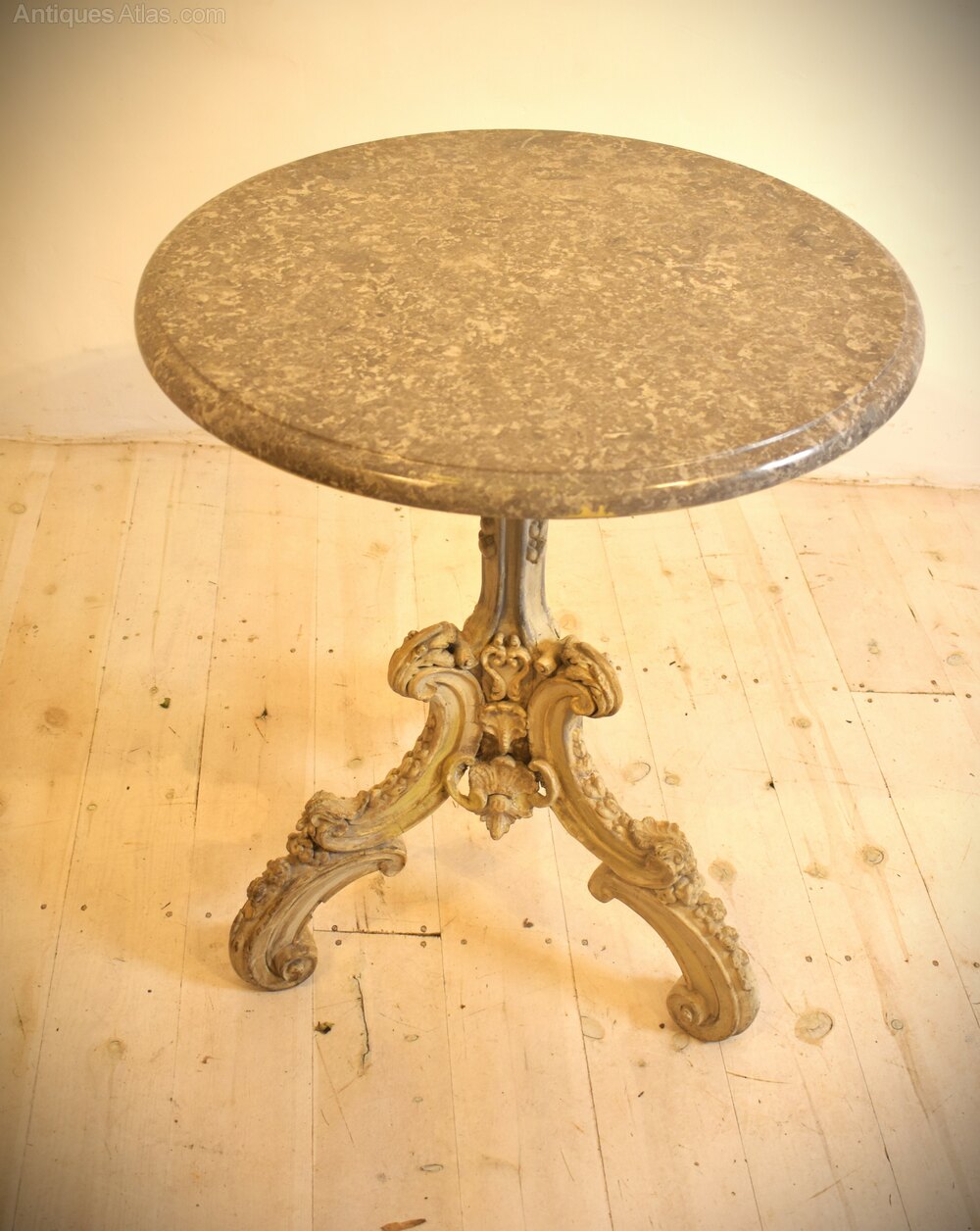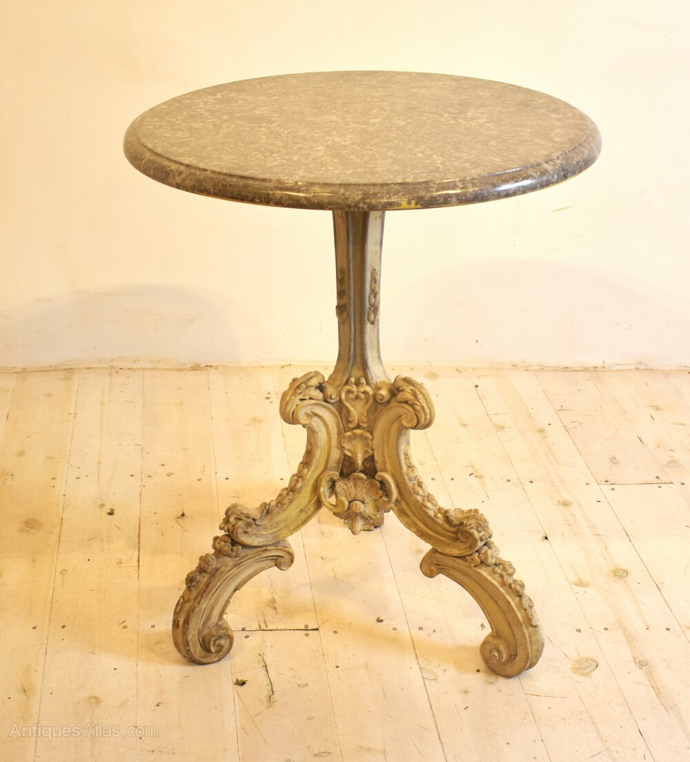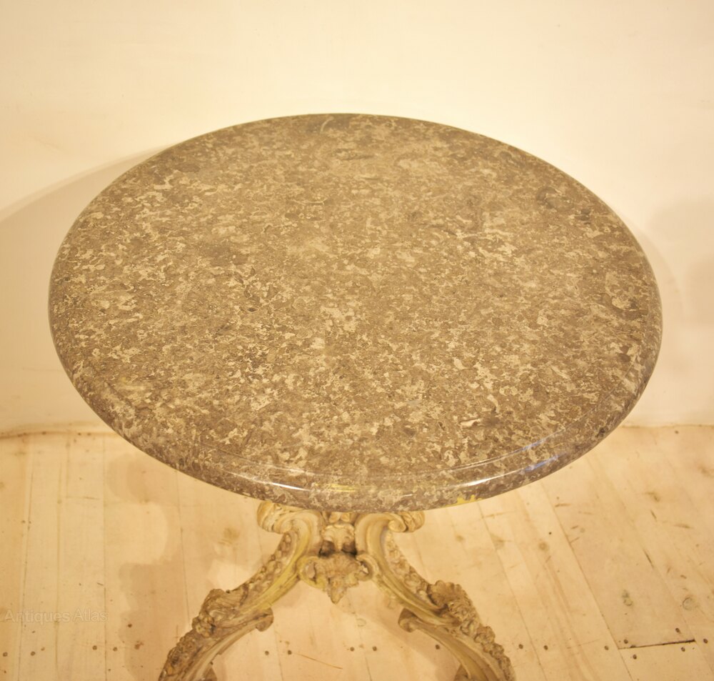 Here we have a marble topped table with an unusual base. The lower half is in a painted finish over a carved and gesso base. The marble is probably a replacement and has no damage and is a good colour grey. This piece is most likely Italian late 18 th century