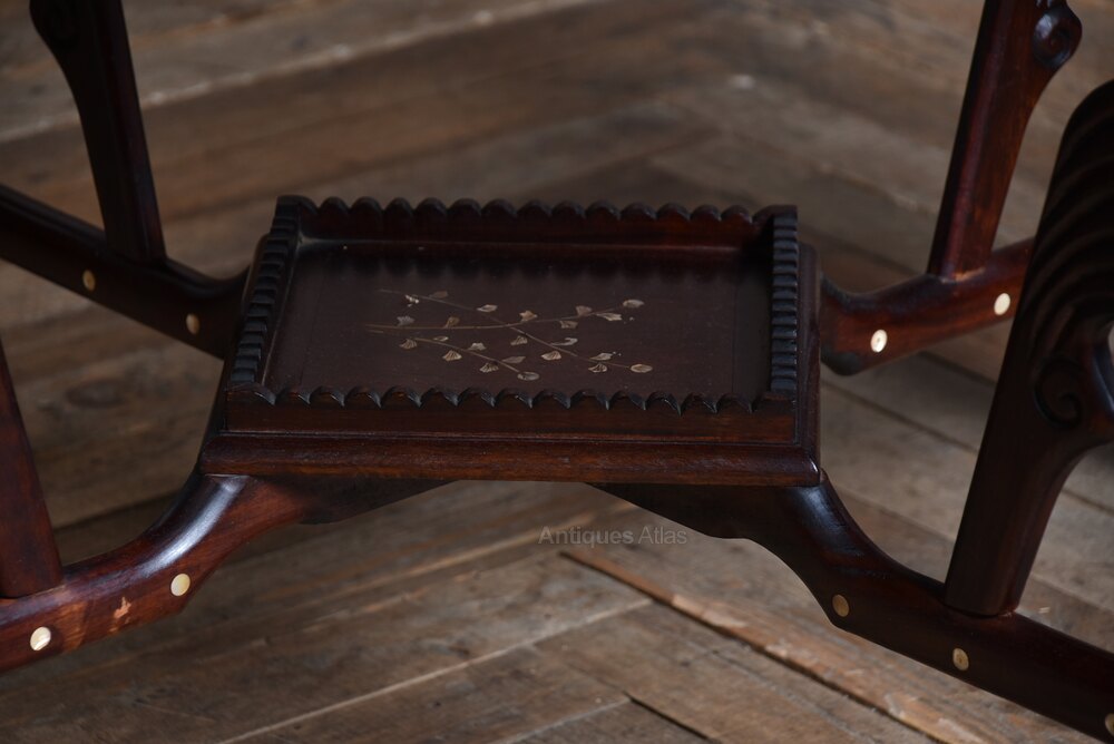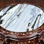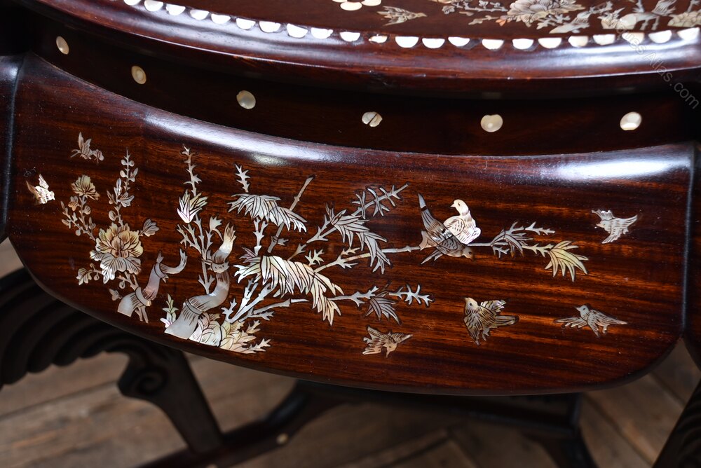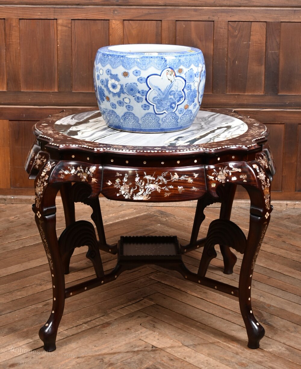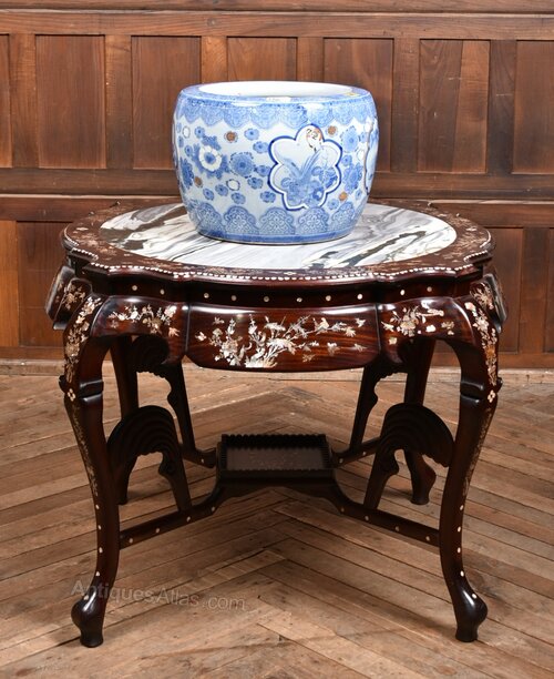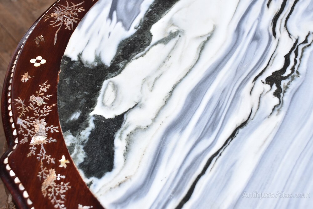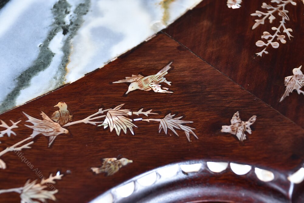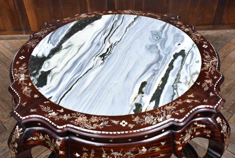 An elegant centre table showcasing a polished marble top with swirling black, white, and grey veining. The dark wood base is richly embellished with mother-of-pearl inlay, forming delicate floral motifs across the apron and cabriole legs. Curved legs with stylised feet and a shaped stretcher lend balance and refinement. The craftsmanship and decorative style suggest an Asian origin, possibly Chinese or Japanese, circa late 19th to early 20th century. This beautifully crafted table offers both charm and character, perfect for discerning collectors or interiors that value craftsmanship and heritage.