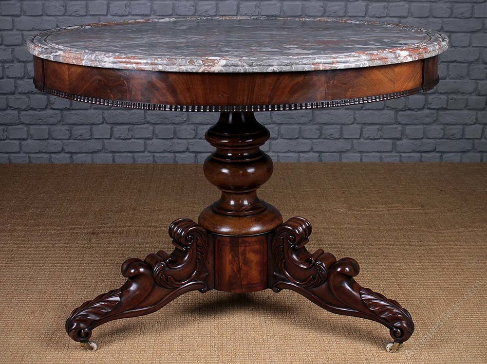 Superb mid 19th.c. French marble top centre table or gueridon c.1840. Exceptional and original 39½” diameter marble top featuring a shaped edge with concentric rings designed to stop spilt drinks from dripping onto the floor. Over a mahogany veneered apron with carved mouldings, raised on a turned column and shaped tripod legs with scrolling acanthus leaf detail and white ceramic castors. Excellent condition, cleaned and waxed in our workshops.
