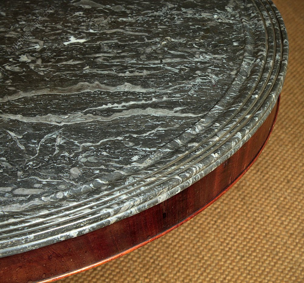 Stylish mid 19th.c. French marble top centre table or gueridon c.1840. Retaining the original inch thick grey marble top with a beautifully moulded edge of concentric rings designed to stop spilt drinks from running off the sides. Mahogany veneered apron on solid oak groundwork. Turned and reeded baluster form pedestal and a tripod base in solid mahogany. The legs carved with acanthus leaf detail and lion’s paw feet raised on neat little brass castors. An old chip to the edge of the marble, otherwise excellent condition, cleaned and polished in our workshops.